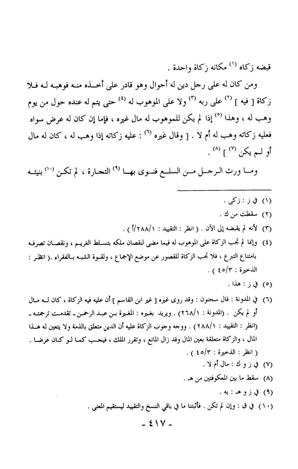ومن كان له على رجل دين له أخوال وهو قادر على أخذه منه فوهبه له فلا زكاة [فيه] على ربه ولا على الموهوب له حتى يتم له عنده حول من يوم وهب له، وهذا إذا لم يكن للموهوب له مال غيره، فإما إن كان له عرض سواه فعليه زكاته وهب له أم لا. [وقال غيره: عليه زكاته إذا وهب له، كان له مال أو لم يكن] .