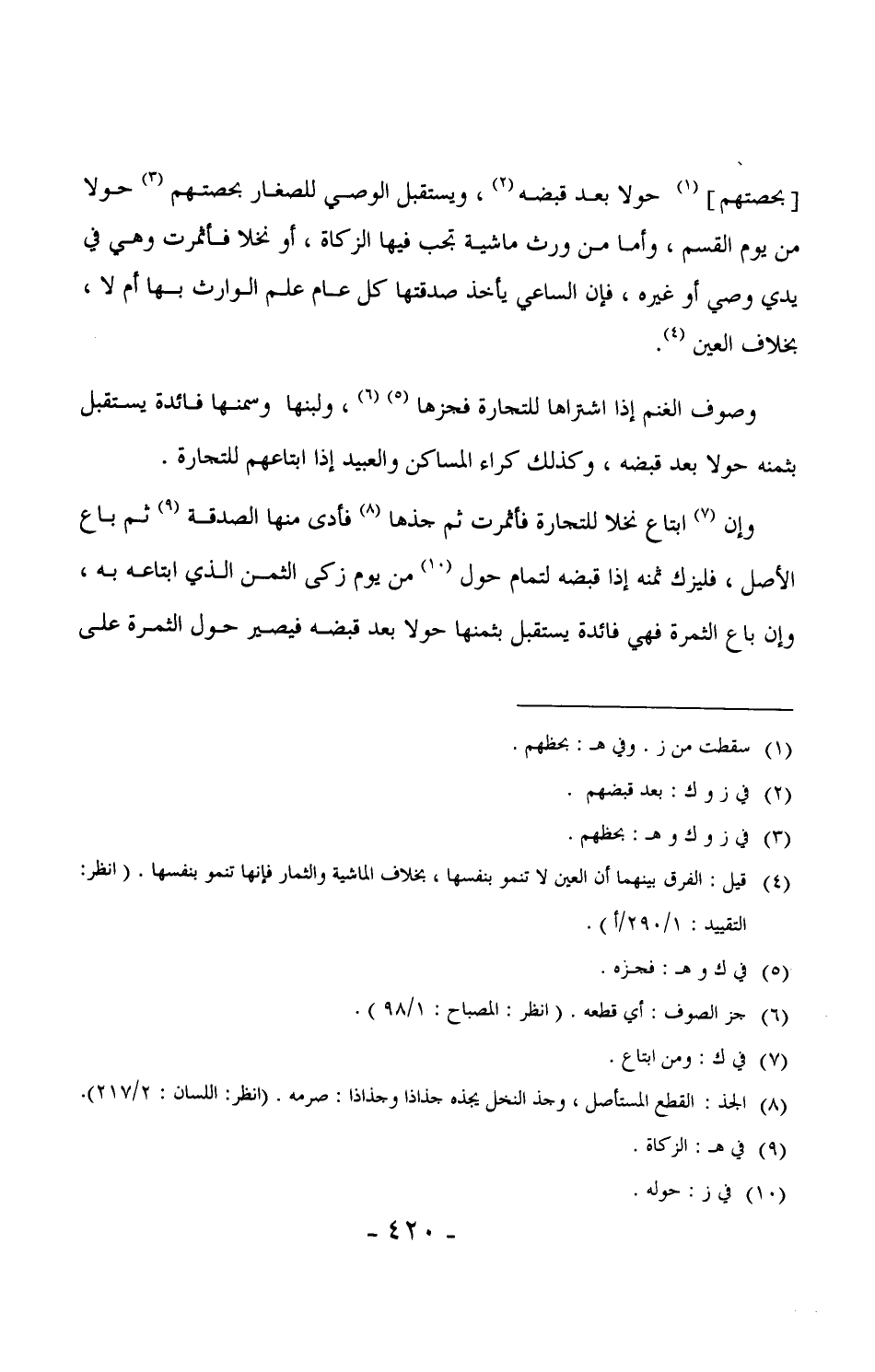 559 - وصوف الغنم إذا اشتراها للتجارة فجزها، ولبنها وسمنها فائدة يستقبل بثمنه حولاً بعد قبضه، وكذلك كراء المساكن والعبيد إذا ابتاعهم للتجارة.