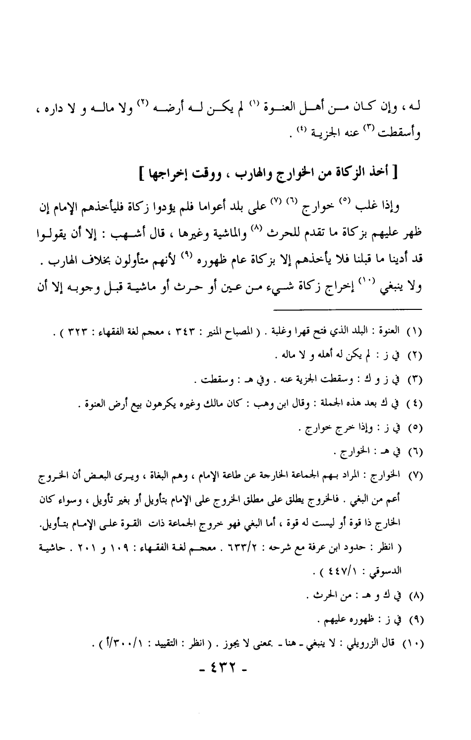 582 - وإذا غلب خوارج على بلد أعواماً فلم يؤدوا زكاة فليأخذهم الإمام إن ظهر عليهم بزكاة ما تقدم للحرث والماشية وغيرها، قال أشهب: إلا أن يقولوا قد أدينا ما قبلنا فلا يأخذهم إلا بزكاة عام ظهوره لأنهم متأولون بخلاف الهارب. ولا ينبغي إخراج زكاة شيء من عين أو حرث أو ماشية قبل وجوبه إلا أن
