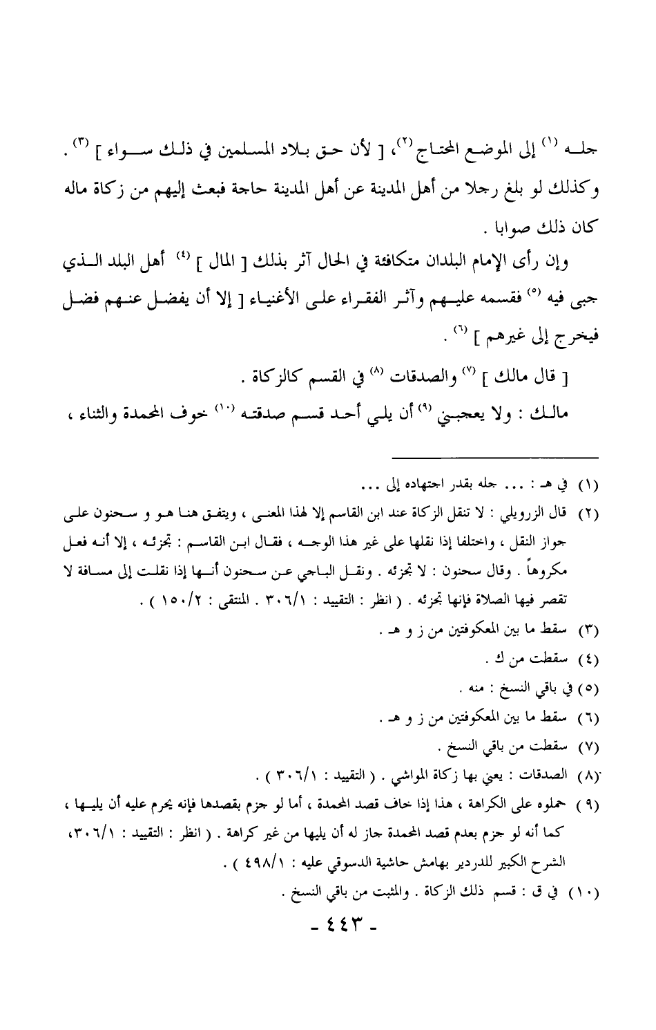 600 - وإن رأى الإمام البلدان متكافئة في الحال آثر بذلك [المال] أهل البلد الذي جبي فيه فقسمه عليهم وآثر الفقراء على الأغنياء [إلا أن يفضل عنهم فضل فيخرج إلى غيرهم] .
