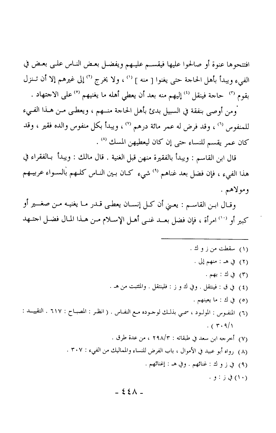 608 - ومن أوصى بنفقة في السبيل بدئ بأهل الحاجة منهم، ويعطى من هذا الفيء للمنفوس، وقد فرض له عمر مائة درهم، ويبدأ بكل منفوس والده فقير، وقد كان عمر يقسم للنساء حتى إن كان ليعطيهن المسك.