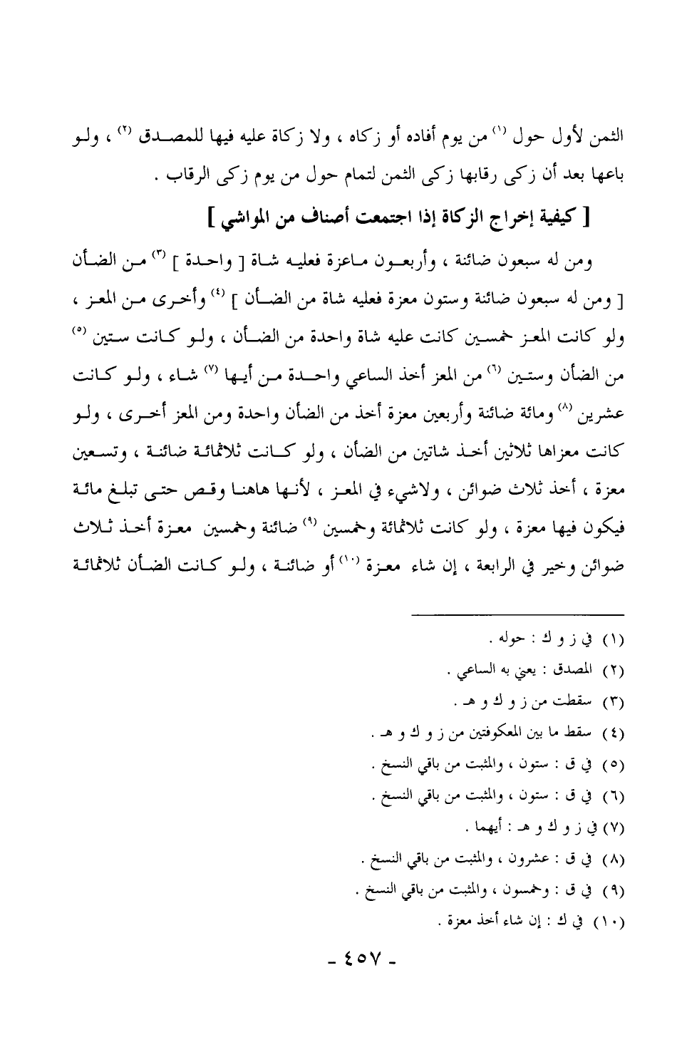 625 - ومن له سبعون ضائنة، وأربعون ماعزة فعليه شاة [واحدة] من الضأن [ومن له سبعون ضائنة وستون معزة فعليه شاة من الضأن] وأخرى من المعز، ولو كانت المعز خمسين كانت عليه شاة واحدة من الضأن، ولو كانت ستين من الضأن وستين من المعز أخذ الساعي واحدة من أيها شاء، ولو كانت عشرين ومائة ضائنة وأربعين معزة أخذ من الضأن واحدة ومن المعز أخرى، ولو كانت معزاها ثلاثين أخذ شاتين من الضأن، ولو كانت ثلاثمائة ضائنة، وتسعين معزة، أخذ ثلاث ضوائن، ولا شيء في المعز، لأنها هاهنا وقص حتى تبلغ مائة فيكون فيها معزة، ولو كانت ثلاثمائة وخمسين ضائنة وخمسين معزة أخذ ثلاث ضوائن وخير في الرابعة، إن شاء معزة أو ضائنة، ولو كانت الضأن ثلاثمائة