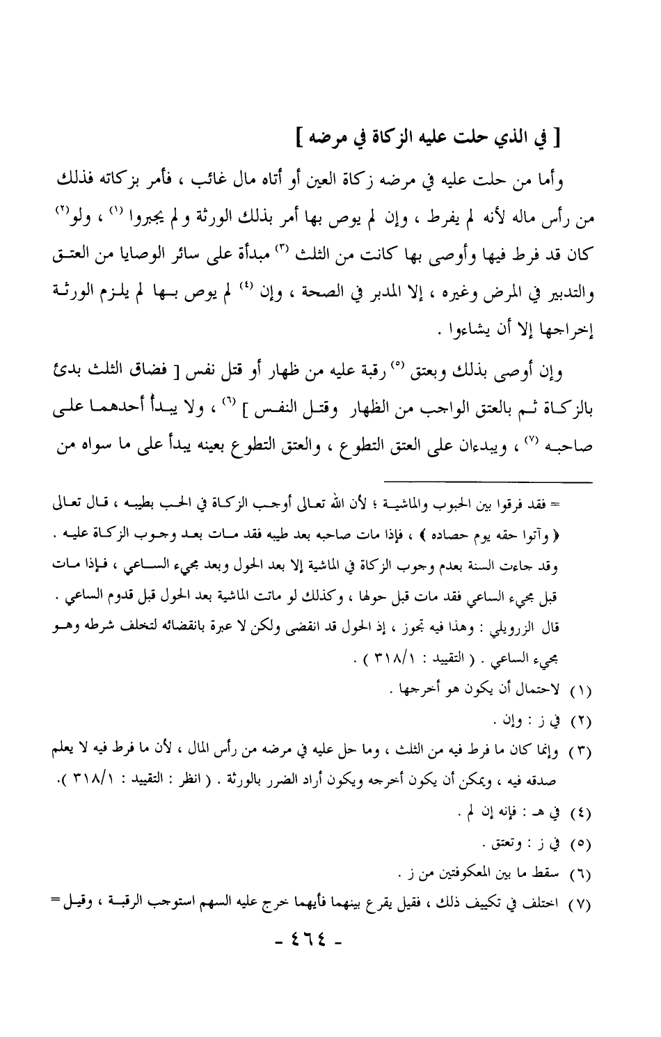 638 - وأما من حلت عليه في مرضه زكاة العين أو أتاه مال غائب، فأمر بزكاته فذلك من راس ماله لأنه لم يفرط، وإن لم يوص بها أمر بذلك الورثة ولم يجبروا، ولو كان قد فرط فيها وأوصى بها كانت من الثلث مبدأة على سائر الوصايا من العتق والتدبير في المرض وغيره، إلا المدبر في الصحة، وإن لم يوص بها لم يلزم الورثة إخراجها إلا أن يشاءوا.