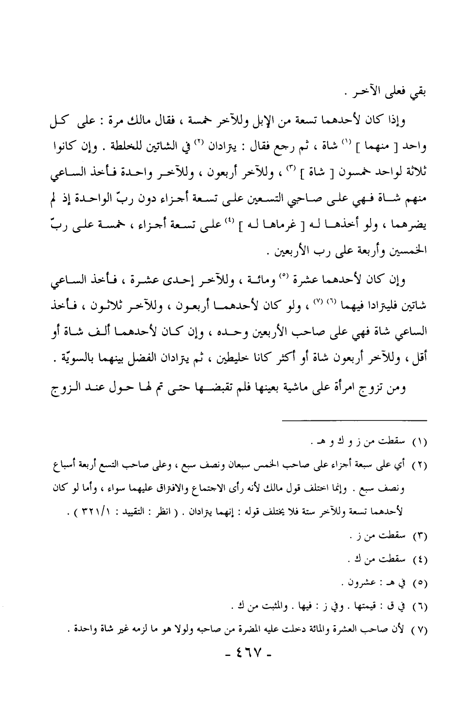 وإذا كان لأحدهما تسعة من الإبل وللآخر خمسة، فقال مالك مرة: على كل واحد بمنهما] شاة، ثم رجع فقال: يترادان في الشاتين للخلطة. وإن كانوا ثلاثة لواحد خمسون [شاة] ، وللآخر أربعون، وللآخر واحدة فأخذ الساعي منهم شاة فهي على صاحبي التسعين على تسعة أجزاء دون رب الواحدة إذ لم يضرهما، ولو أخذها له [غرماها له] على تسعة أجزاء، خمسة على رب الخمسين وأربعة على رب الأربعين.