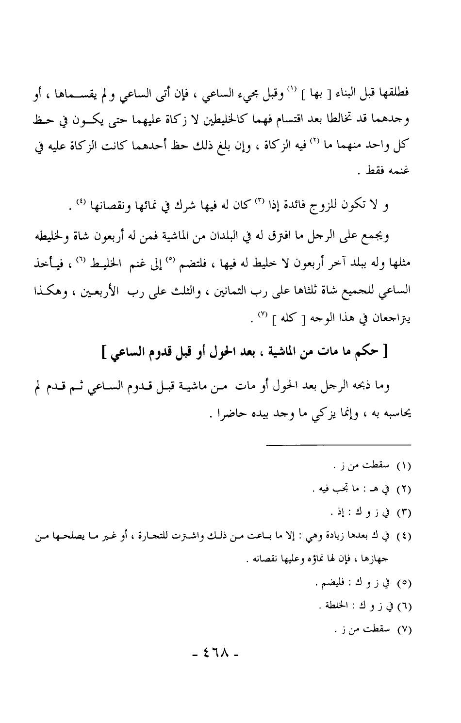 646 - وما ذبحه الرجل بعد الحول أو مات من ماشية قبل قدوم الساعي ثم قدم لم يحاسبه به، وإنما يزكي ما وجد بيده حاضراً. (¬1)
