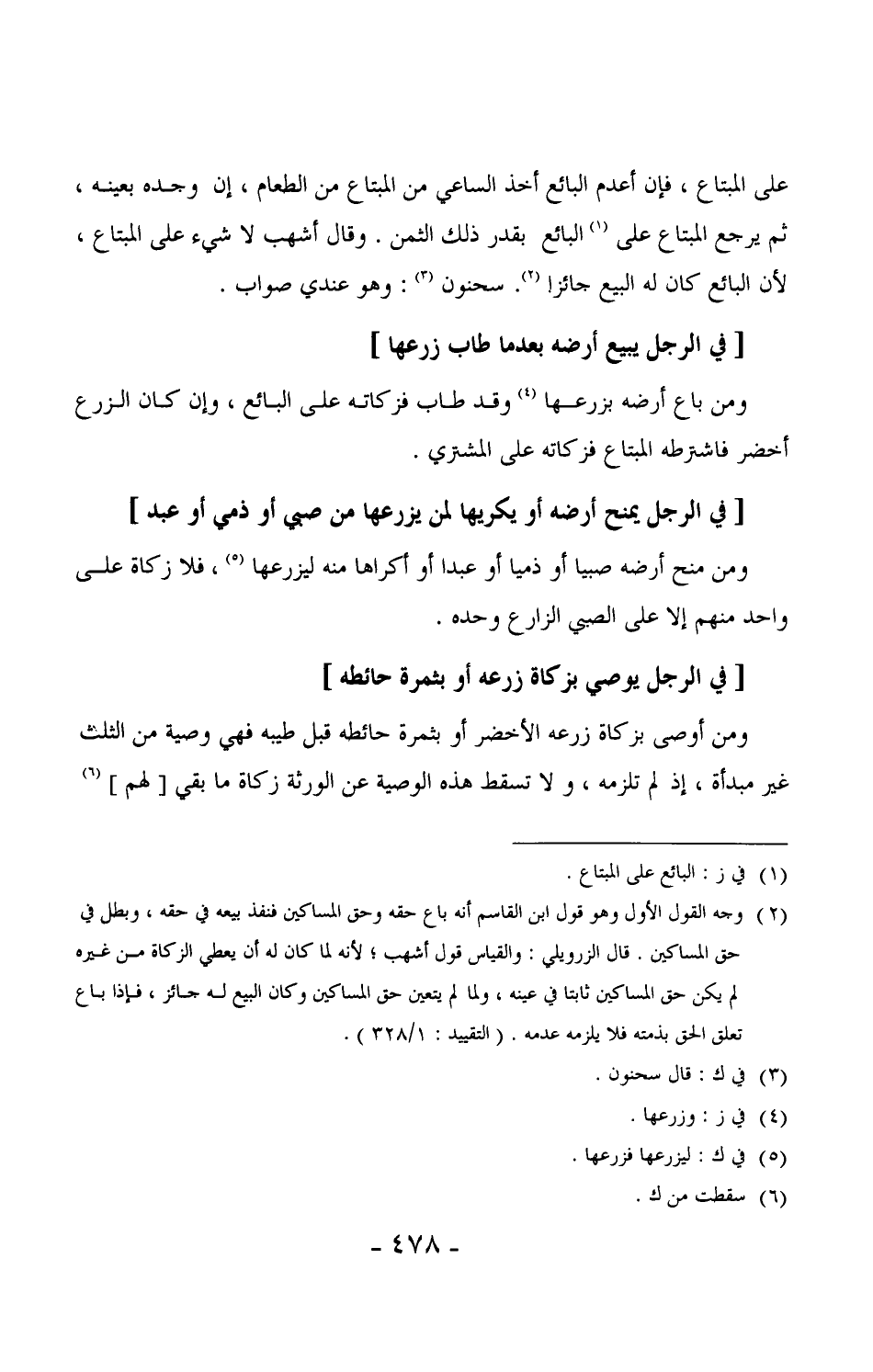 667 - ومن أوصى بزكاة زرعه الأخضر أو بثمرة حائطه قبل طيبه فهي وصية من الثلث غير مبدأة، إذ لم تلزمه، ولا تسقط هذه الوصية عن الورثة زكاة ما بقي [لهم]