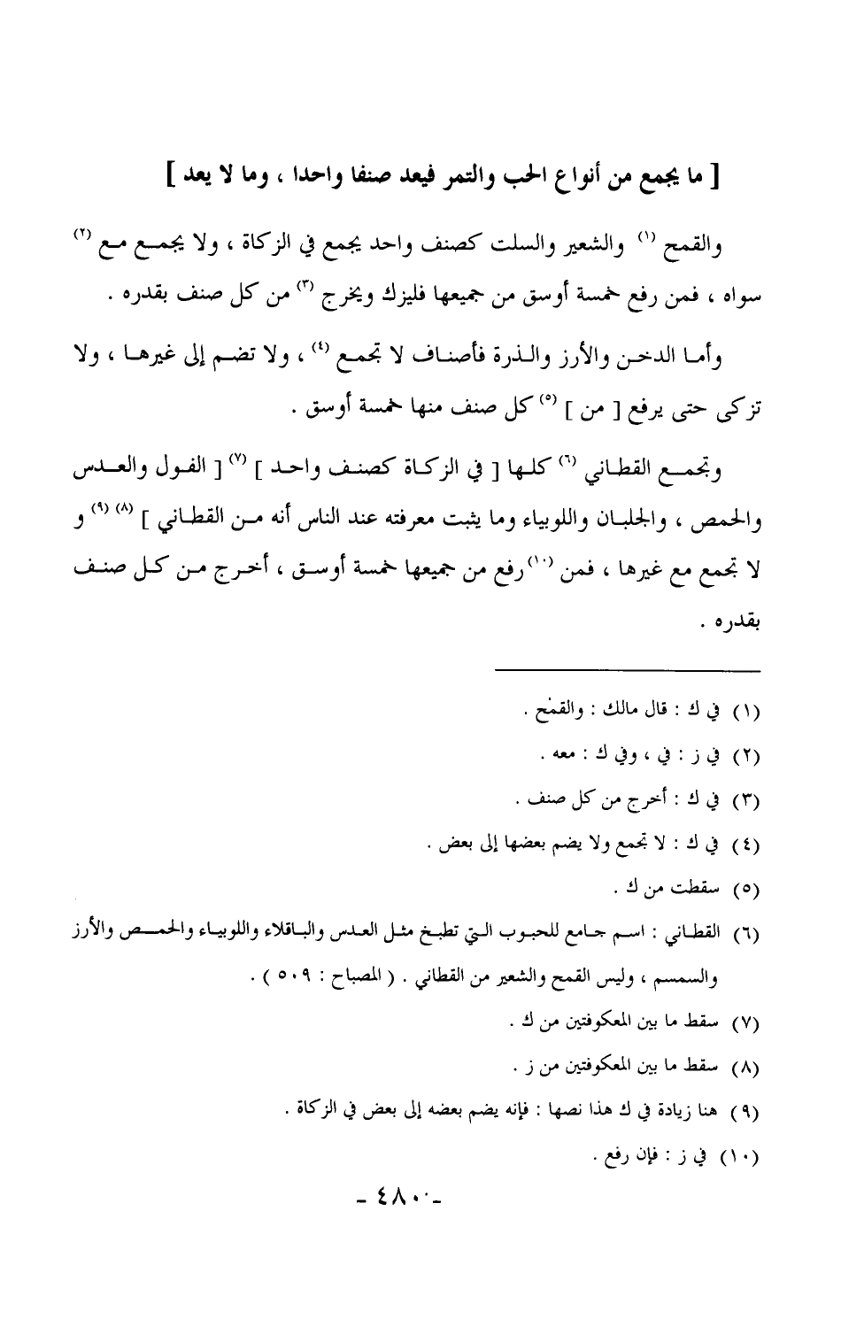 671 - وتجمع القطاني كلها [في الزكاة كصنف واحد] [الفول والعدس والحمص، والجلبان واللوبياء وما يثبت معرفته عند الناس أنه من القطاني] ولا تجمع مع غيرها، فمن رفع من جميعها خمسة أوسق، أخرج من كل صنف بقدره.