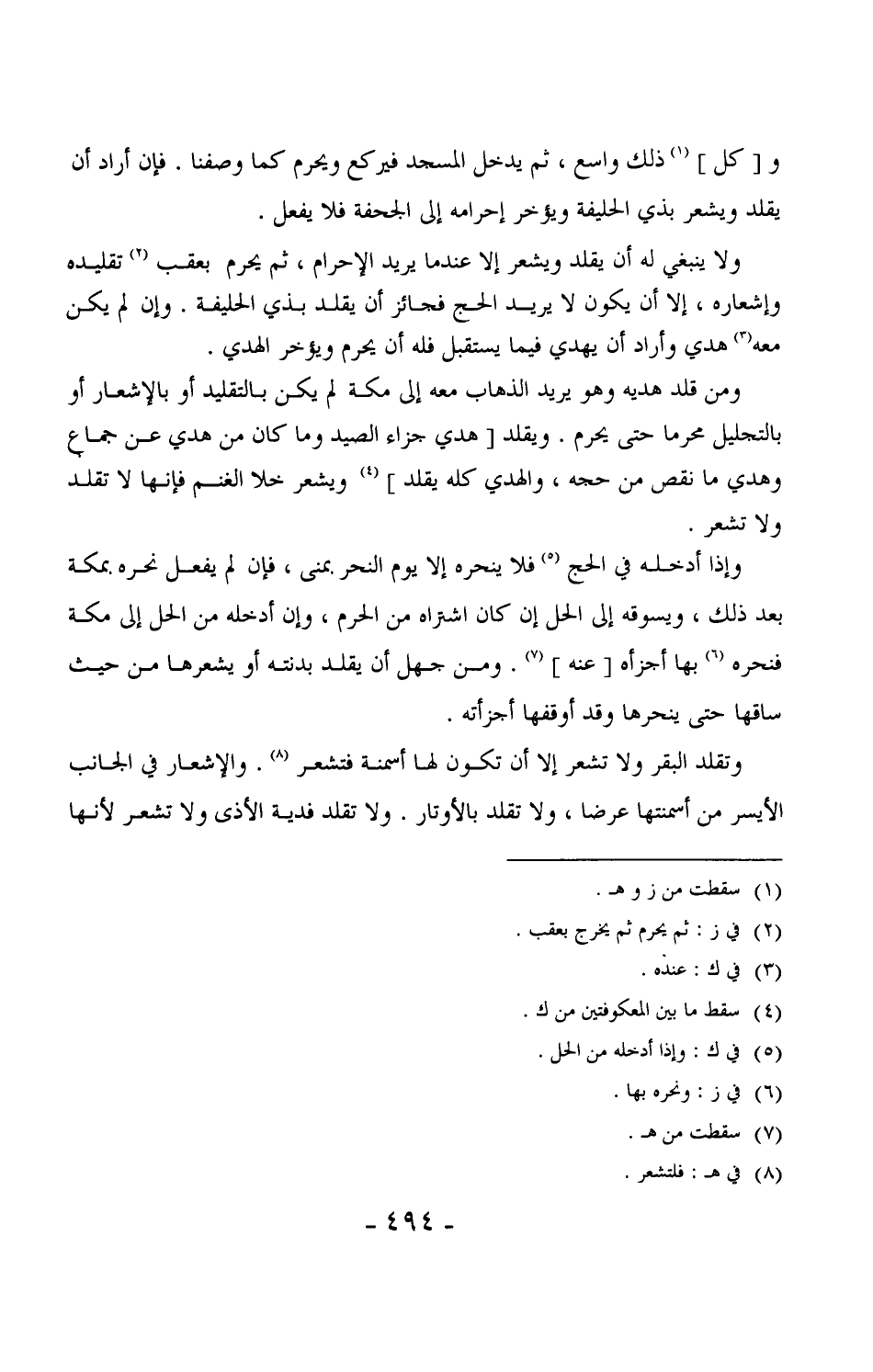 701 - وتقلد البقر ولا تشعر إلا أن تكون لها أسمنة فتشعر. والإشعار في الجانب الأيسر من أسمنتها عرضاً، ولا تقلد بالأوتار. ولا تقلد فدية الأذى ولا تشعر لأنها