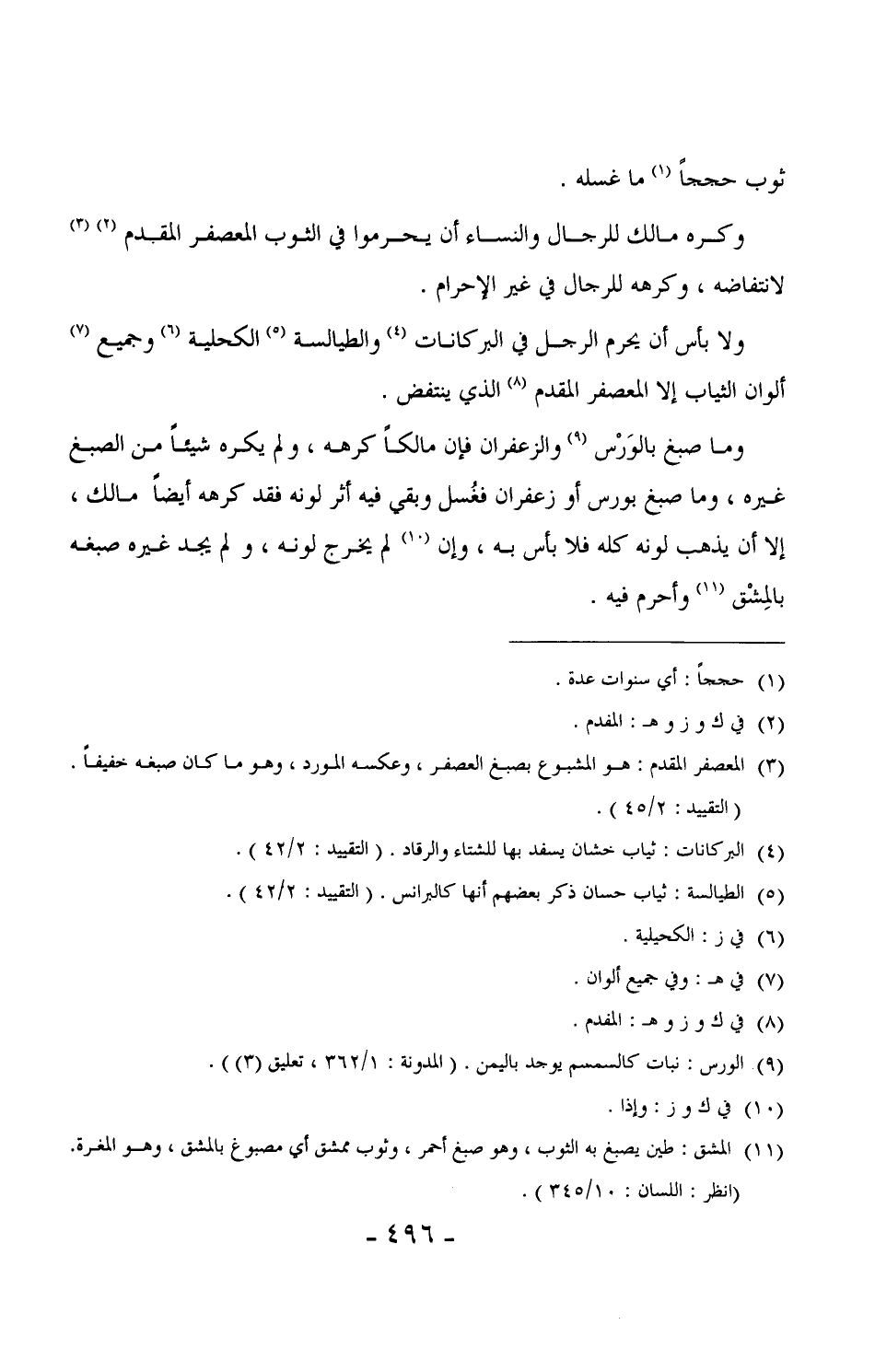 707 - وما صبغ بالوَرْس (¬2) والزعفران (¬3) فإن مالكاً كرهه، ولم يكره شيئاً من الصبغ غيره، وما صبغ بورس أو زعفران فغُسل وبقي فيه أثر لونه فقد كرهه أيضاً مالك، إلا أن يذهب لونه كله فلا بأس به، وإن لم يخرج لونه، ولم يجد غيره صبغه بالمِشْق وأحرم فيه.