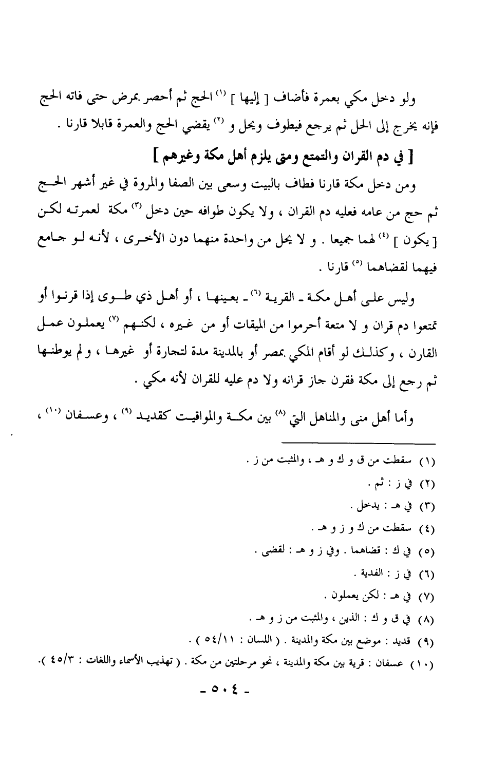 725 - وليس على أهل مكة - القرية - بعينها، أو أهل ذي طوى إذا قرنوا أو تمتعوا دم قران ولا متعة أحرموا من الميقات أو من غيره، لكنهم يعملون عمل القارن، وكذلك لو أقام المكي بمصر أو بالمدينة مدة لتجارة أو غيرها، ولم يوطنها ثم رجع إلى مكة فقرن جاز قرانه ولا دم عليه للقران لأنه مكي.