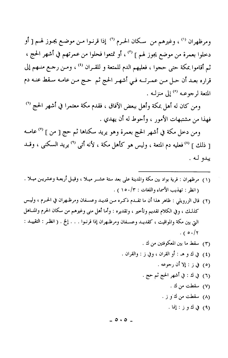 ومرظهران، وغيرهم من سكان الحرم إذا قرنوا من موضع يجوز لهم [أو دخلوا بعمرة من موضع يجوز لهم] ، أو تمتعوا فحلوا من عمرتهم في أشهر الحج، ثم أقاموا بمكة حتى حجوا، فعليهم الدم للمتعة وللقران، ومن رجع منهم إلى قراره بعد أن حل من عمرته في أشهر الحج ثم حج من عامه سقط عنه دم المتعة لرجوعه إلى منزله.