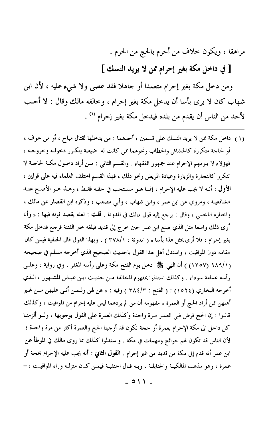 741 - ومن دخل مكة بغير إحرام متعمداً أو جاهلاً فقد عصى ولا شيء عليه، لأن ابن شهاب كان لا يرى بأساً أن يدخل مكة بغير إحرام، وخالفه مالك وقال: لا أحب لأحد من الناس أن يقدم من بلده فيدخل مكة بغير إحرام.