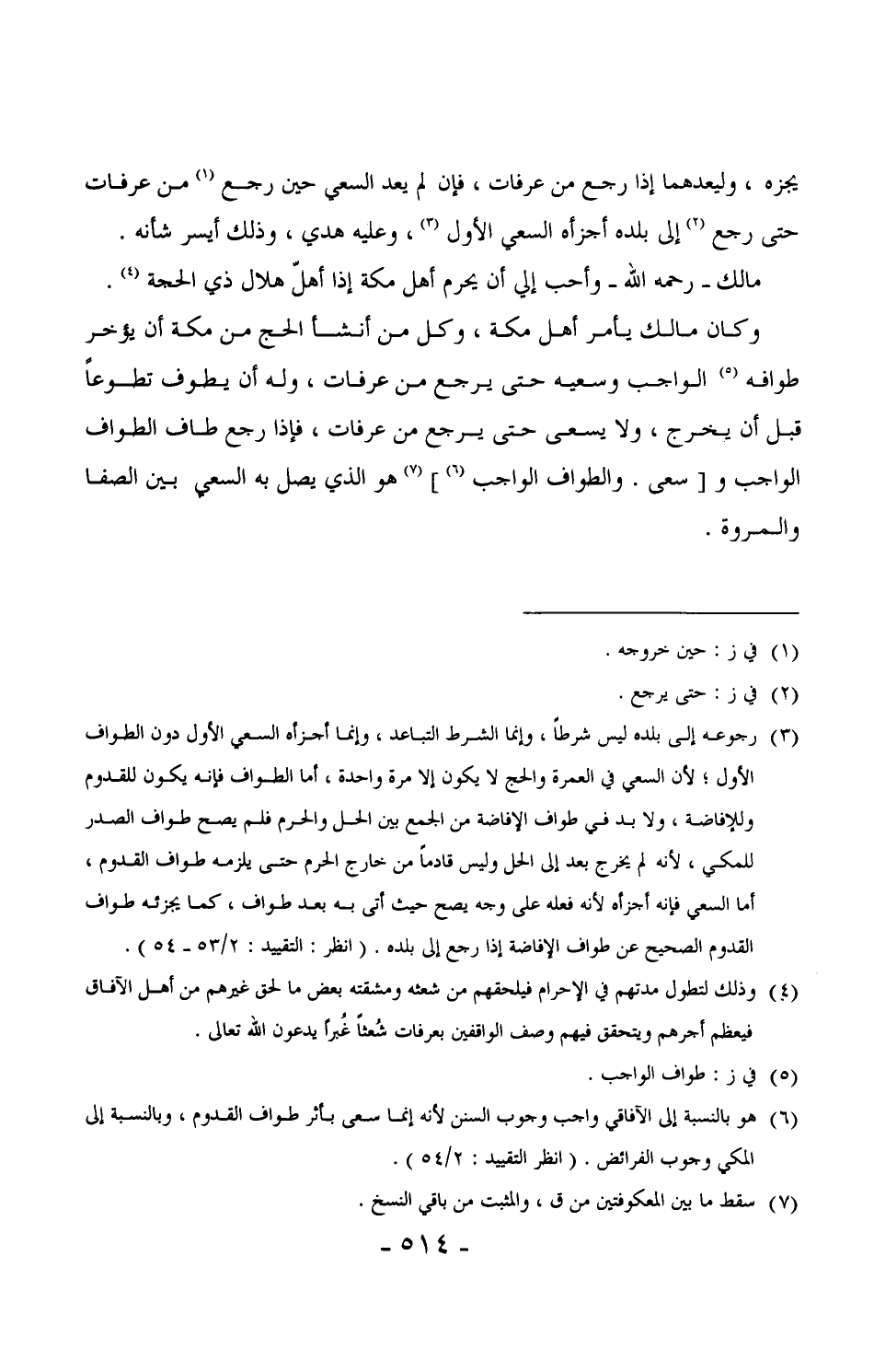 وكان مالك يأمر أهل مكة، وكل من أنشأ الحج من مكة أن يؤخر طوافه الواجب وسعيه حتى يرجع من عرفات، وله أن يطوف تطوعاً قبل أن يخرج، ولا يسعى حتى يرجع من عرفات، فإذا رجع طاف الطواف الواجب و [سعى. والطواف الواجب] هو الذي يصل به السعي بين الصفا والمروة.
