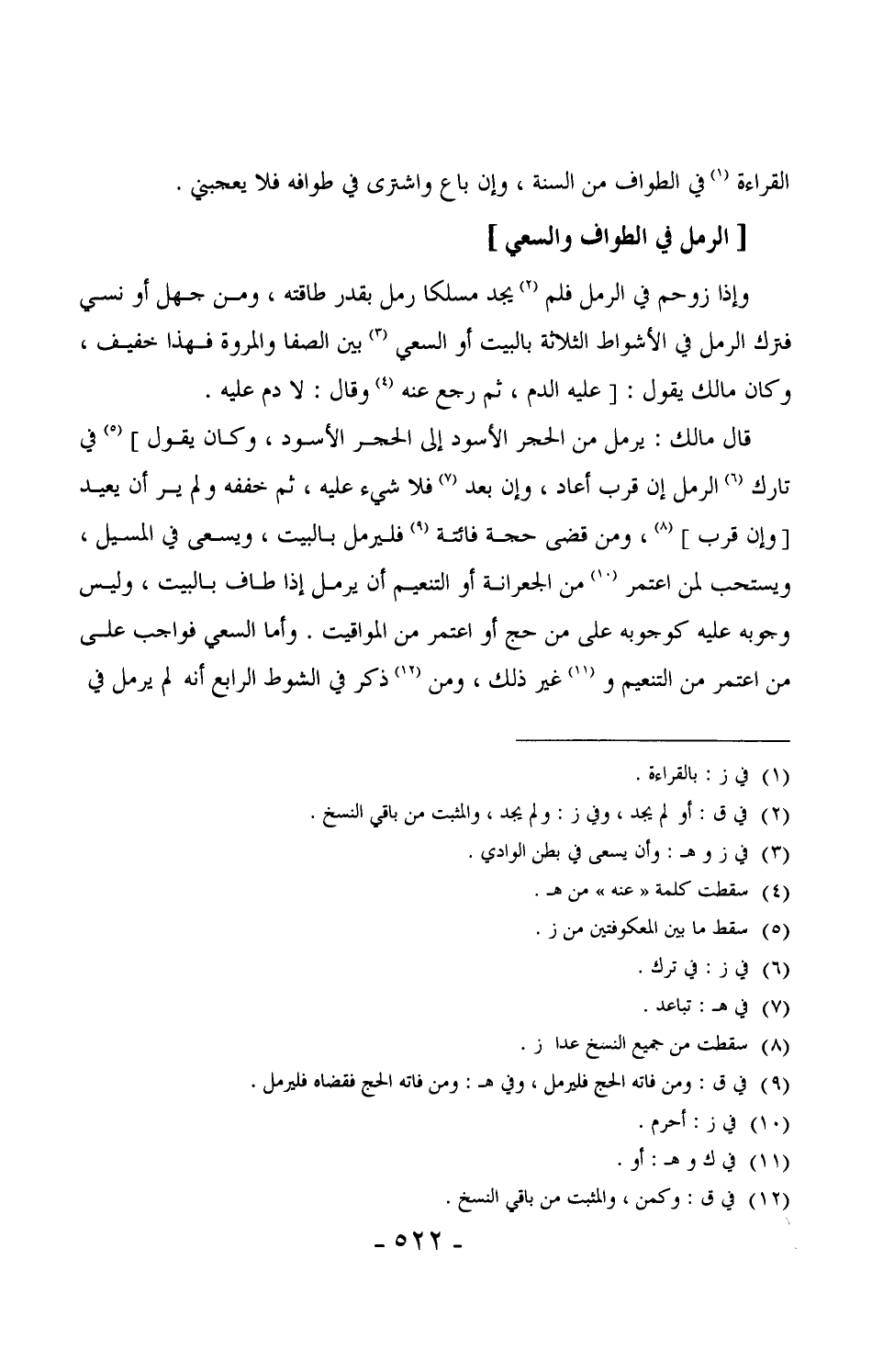 762 - وإذا زوحم في الرمل (¬1) فلم يجد مسلكاً رمل بقدر طاقته، ومن جهل أو نسي فترك الرمل في الأشواط الثلاثة بالبيت أو السعي بين الصفا والمروة فهذا خفيف، وكان مالك يقول: [عليه الدم، ثم رجع عنه وقال: لا دم عليه.