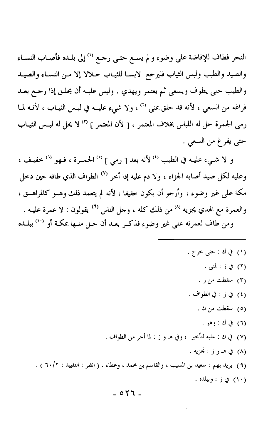 النحر فطاف للإفاضة على وضوء ولم يسع حتى رجع إلى بلده فأصاب النساء والصيد والطيب وليس الثياب فليرجع لابساً للثياب حلالاً إلا من النساء والصيد والطيب حتى يطوف ويسعى ثم يعتمر ويهدي. وليس عليه أن يحلق إذا رجع بعد فراغه من السعي، لأنه قد حلق بمنى، ولا شيء عليه في لبس الثياب، لأنه لما رمى الجمرة حل له اللباس بخلاف المعتمر، [لأن المعتمر] لا يحل له ليس الثياب حتى يفرغ من السعي.