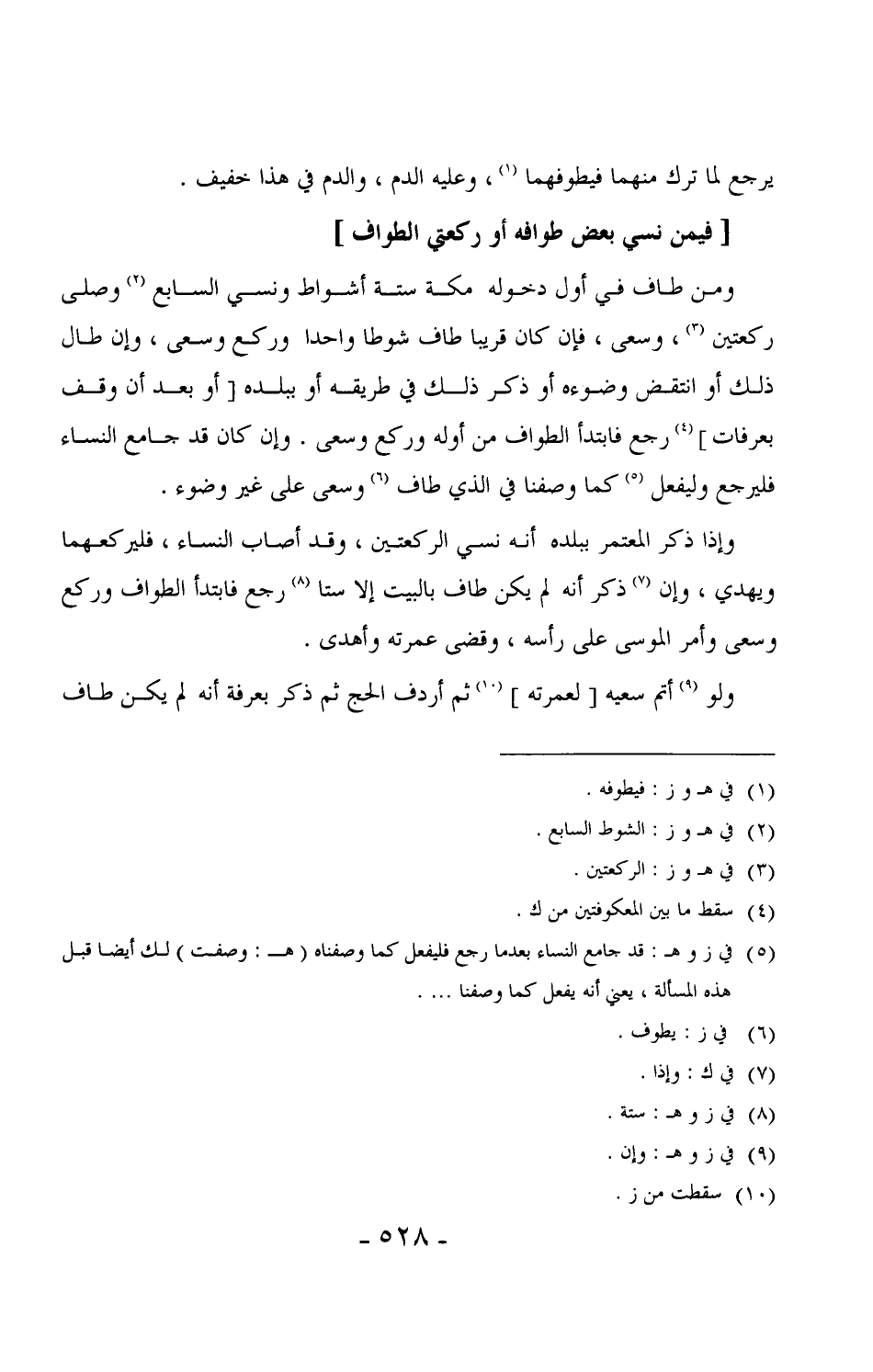 777 - ومن طاف في أول دخوله مكة ستة أشواط ونسي السابع وصلى ركعتين، وسعى، فإن كان قريباً طاف شوطاً واحداً، وركع وسعى، وإن طال ذلك أو انتقض وضوءه أو ذكر ذلك في طريقه أو ببلده [أو بعد أن وقف بعرفات] رجع فابتدأ الطواف من أوله وركع وسعى. وإن كان قد جامع النساء فليرجع وليفعل كما وصفنا في الذي طاف وسعى على غير وضوء.