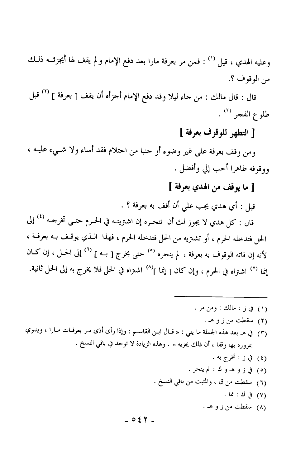 807 - ومن وقف بعرفة على غير وضوء أو جنباً من احتلام فقد أساء ولا شيء عليه، ووقوفه طاهراً أحب إلي وأفضل.