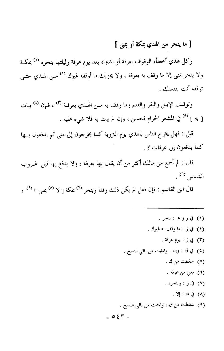 808 - وكل هدي أخطأه الوقوف بعرفة أو اشتراه بعد يوم عرفة وليلتها ينحره بمكة ولا ينحر بمنى إلا ما وقف به بعرفة، ولا يجزيك ما أوقفه غيرك من الهدي حتى توقفه أنت بنفسك.