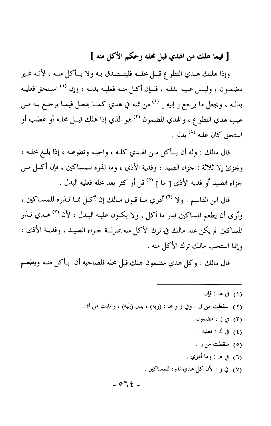 860 - وإذا هلك هدي التطوع قبل محله فليتصدق به ولا يأكل منه، لأنه غير مضمون، وليس عليه بدله، فإن أكل منه فعليه بدله، وإن استحق فعليه بدله، ويجعل ما يرجع [إليه] من ثمنه في هدي كما يفعل فيما يرجع به من عيب هدي التطوع، والهدي المضمون هو الذي إذا هلك قبل محله أو عطب أو استحق كان عليه بدله.