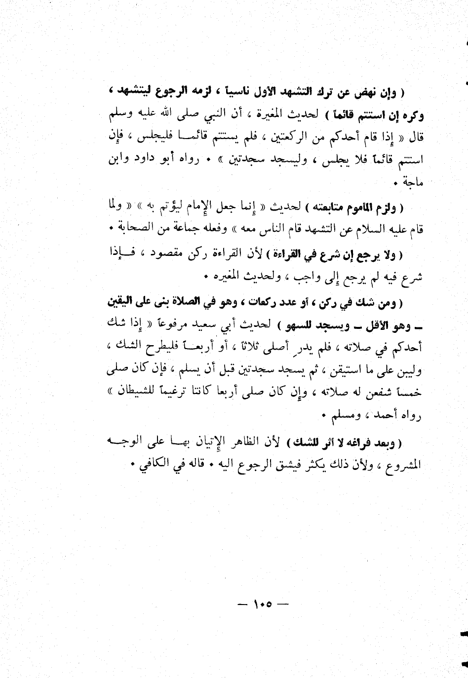 [ومن شك في ركن، أو عدد ركعات، وهو في الصلاة بنى على اليقين - وهو الأقل - ويسجد للسهو] لحديث أبي سعيد مرفوعاً: "إذا شك أحدكم في صلاته، فلم يدرأصلى ثلاثاً، أو أربعاً فليطرح الشك، وليبن على ما استيقن، ثم يسجد سجدتين قبل أن يسلم، فإن كان صلى خمساً شفعن له صلاته، فإن كان صلى أربعاً كانتا ترغيماً للشيطان" رواه أحمد، ومسلم.