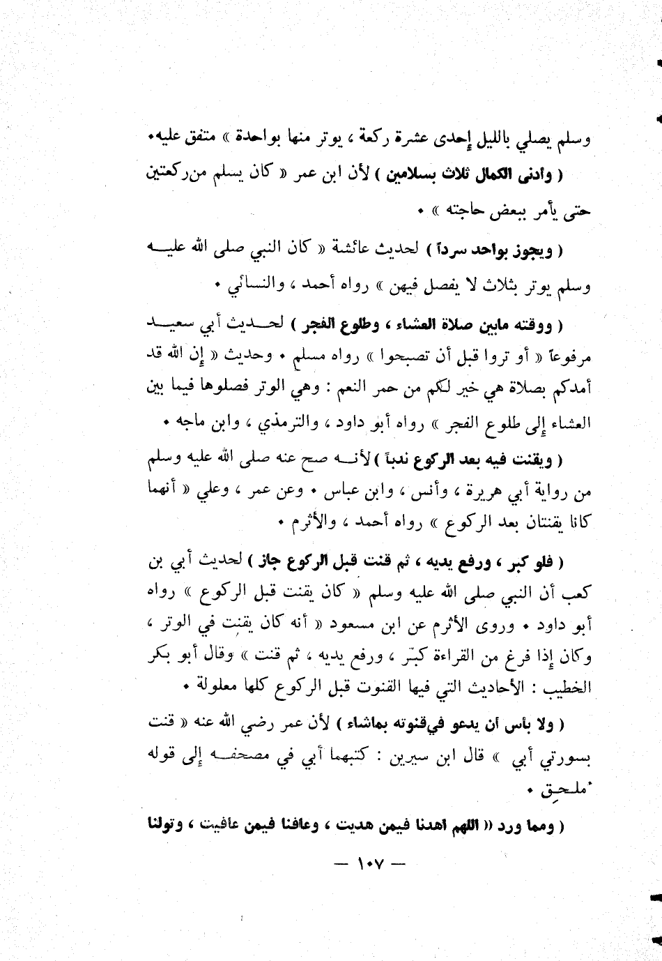 [ووقته ما بين صلاة العشاء، وطلوع الفجر] لحديث أبي سعيد مرفوعاً: "أوتروا قبل أن تصبحوا" رواه مسلم. وحديث "إن الله قد أمدكم بصلاة هي خير لكم من حمر النعم: وهي الوتر فصلوها فيما بين العشاء إلى طلوع الفجر" رواه أبو داود، والترمذي، وابن ماجه.