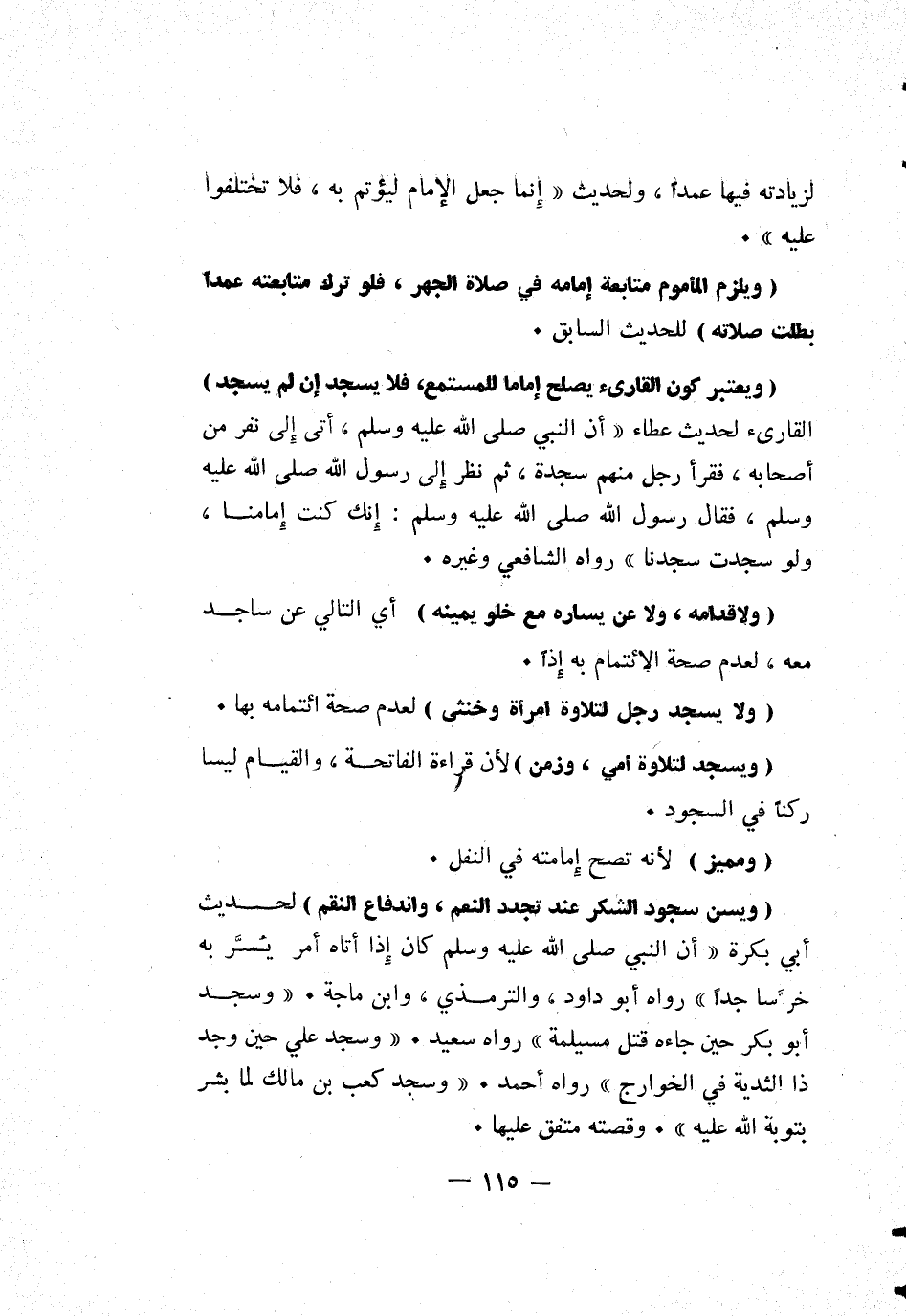 [ويسن سجود الشكر عند تجدد النعم، واندفاع النقم] لحديث أبي بكرة أن النبي صلى الله عليه وسلم كان إذا أتاه أمر يسر به خر ساجداً رواه أبو داود، والترمذي، وابن ماجة. وسجد أبو بكر حين جاءه قتل مسيلمة رواه سعيد. وسجد علي حين وجد ذا الثدية في الخوارج رواه أحمد. وسجد كعب بن مالك لما بشر بتوبة الله عليه. وقصته متفق عليها.