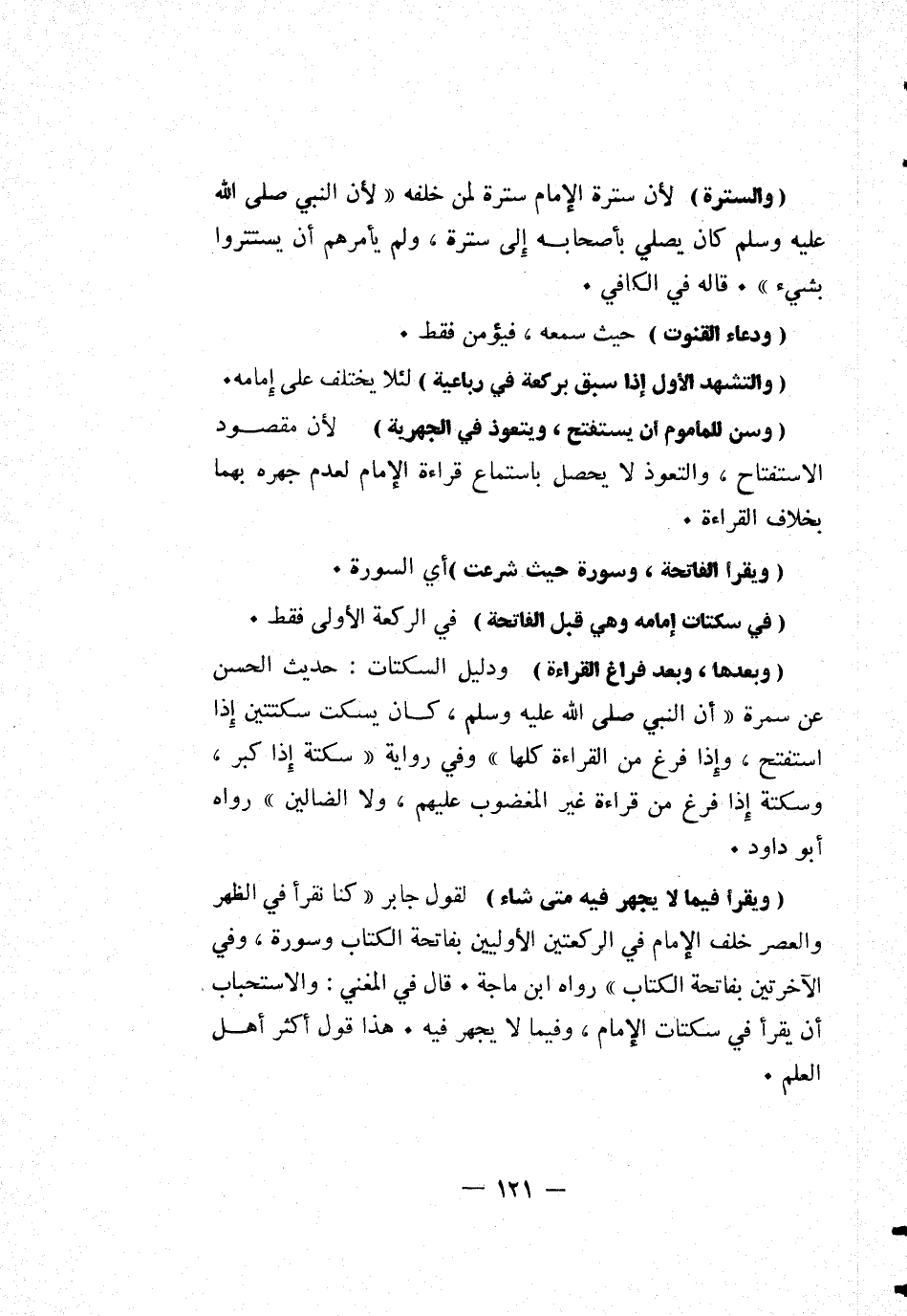 [وبعدها، وبعد فراغ القراءة] ودليل السكتات: حديث الحسن عن سمرة أن النبي صلى الله عليه وسلم، كان يسكت سكتتين إذا استفتح، وإذا فرغ من القراءة كلها وفي رواية سكتة إذا كبر، وسكتة إذا فرغ من قراءة غير المغضوب عليهم، ولا الضالين رواه أبو داود.