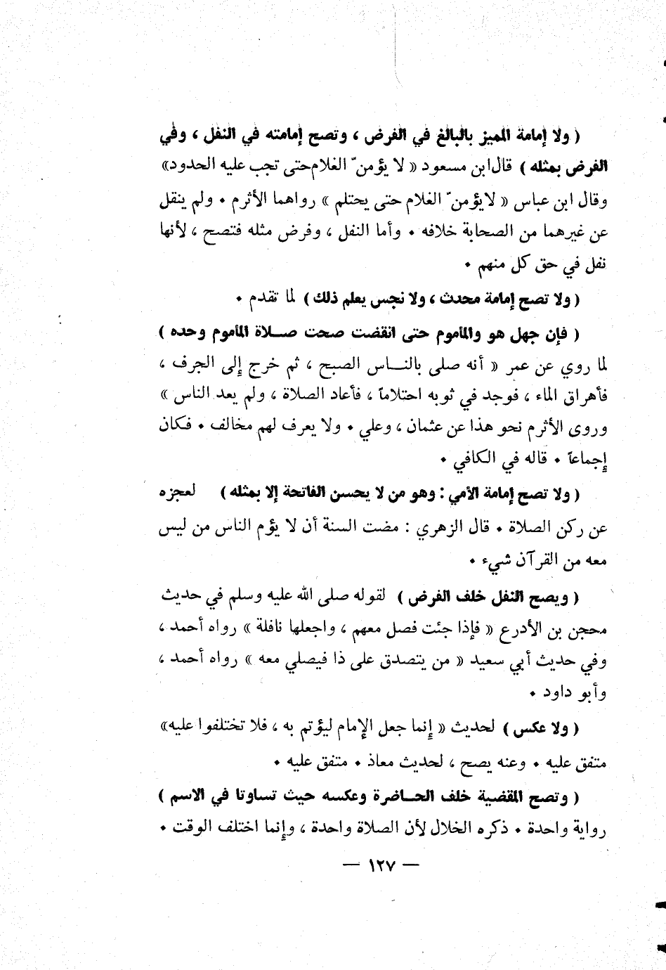 [ولا إمامة المميز بالبالغ في الفرض، وتصح إمامته في النفل، وفي الفرض بمثله] قال ابن مسعود: لا يؤمن الغلام حتى تجب عليه الحدود وقال ابن عباس: لا يؤمن الغلام حتى يحتلم رواهما الأثرم. ولم ينقل عن غيرهما من الصحابة خلافه. وأما النفل، وفرض مثله فتصح، لأنها نفل في حق كل منهم.
