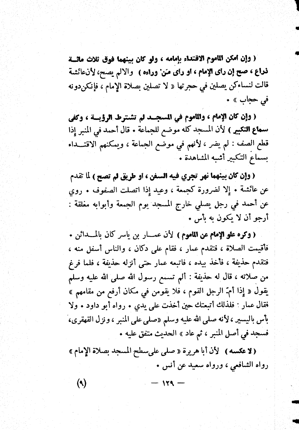 [وإن كان الإمام، والمأموم فى المسجد لم تشترط الرؤية، وكفى سماع التكبير] لأن المسجد كله موضع للجماعة. قال أحمد في المنبر إذا قطع الصف: لم تضر، لأنهم في موضع الجماعة، ويمكنهم الإقتداء بسماع التكبير أشبه المشاهدة.