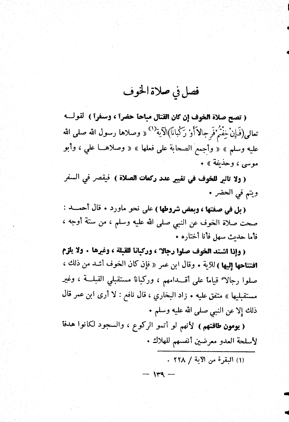 [تصح صلاة الخوف إن كان القتال مباحاً حضراً، وسفراً] لقوله تعالى: {فَإِنْ خِفْتُمْ فَرِجَالاً أَوْ رُكْبَاناً} الآية 1 وصلاها رسول الله صلى الله عليه وسلم وأجمع الصحابة على فعلها وصلاها علي، وأبو موسى، وحذيفة.