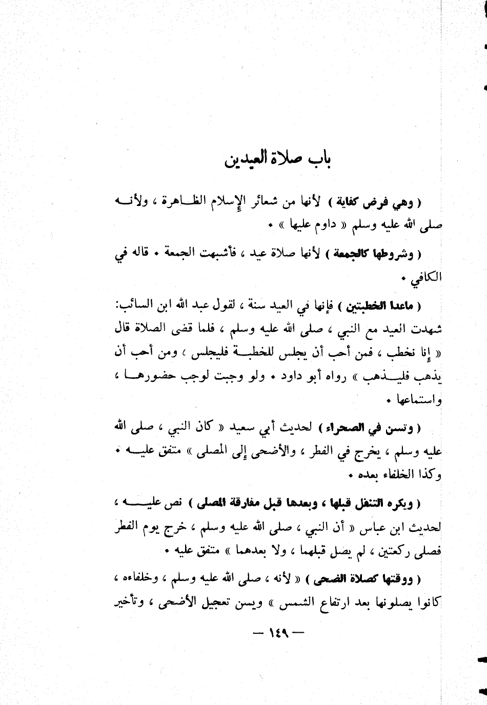 [ووقتها كصلاة الضحى] لأنه صلى الله عليه وسلم، وخلفاءه، كانوا يصلونها بعد ارتفاع الشمس. ويسن تعجيل الأضحى، وتأخير