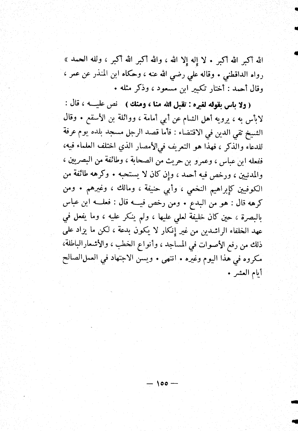 [ولا بأس بقوله لغيره: تقبل الله منا، ومنك] نص عليه، قال: لا بأس به، يرويه أهل الشام عن أبي أمامة، وواثلة بن الأسقع. وقال الشيخ تقي الدين في الاقتضاء: فأما قصد الرجل مسجد بلده يوم عرفة للدعاء والذكر، فهذا هو التعريف في الأمصار الذي اختلف العلماء فيه، ففعله ابن عباس، وعمرو بن حريث من الصحابة، وطائفة من البصريين، والمدنيين، ورخص فيه أحمد، وإن كان لا يستحبه. وكرهه طائفة من الكوفيين كإبراهيم النخعى، وأبي حنيفة، ومالك، وغيرهم. ومن كرهه قال: هو من البدع. ومن رخص فيه قال: فعله ابن عباس بالبصرة، حين كان خليفة لعلى عليها، ولم ينكرعليه، وما يفعل في عهد الخلفاء الراشدين من غير إنكار لا يكون بدعة، لكن ما يزاد على ذلك من رفع الأصوات فى المساجد، وأنواع الخطب، والأشعار الباطلة، مكروه في هذا اليوم وغيره. انتهى. ويسن الاجتهاد في العمل الصالح أيام العشر.