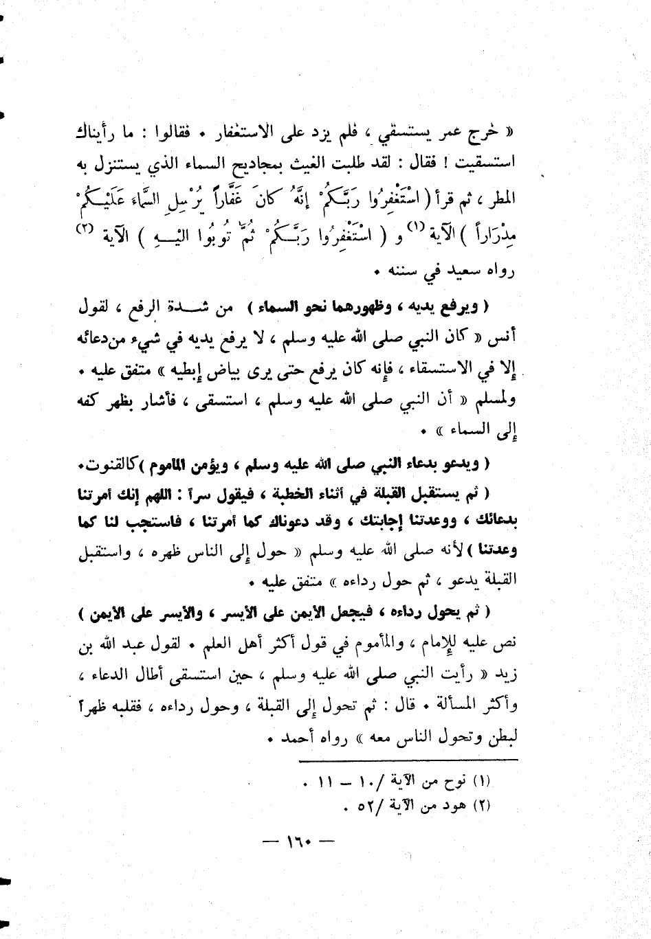 [ويرفع يديه، وظهورهما نحو السماء] من شدة الرفع، لقول أنس: كان النبى صلى الله عليه وسلم، لا يرفع يديه في شئ من دعائه إلا في الإستسقاء، فإنه كان يرفع حتى يرى بياض إبطيه متفق عليه. ولمسلم أن النبي، استسقى، فأشار بظهر كفه إلى السماء.