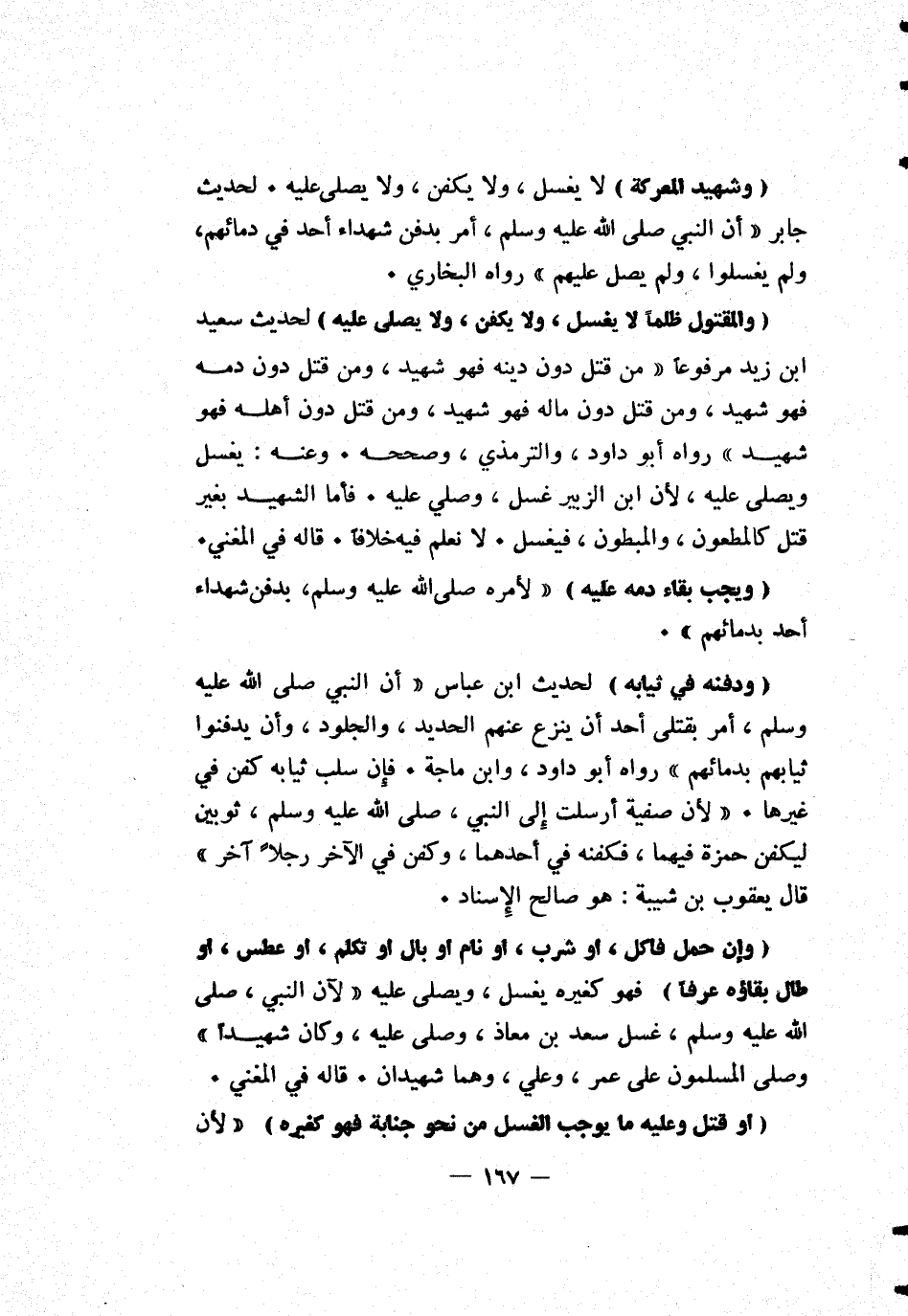 [وشهيد المعركة] لا يغسل، ولا يكفن، ولا يصلى عليه. لحديث جابر أن النبي صلى الله عليه وسلم، أمر بدفن شهداء أحد في دمائهم. ولم يغسلوا، ولم يصل عليهم رواه البخاري.