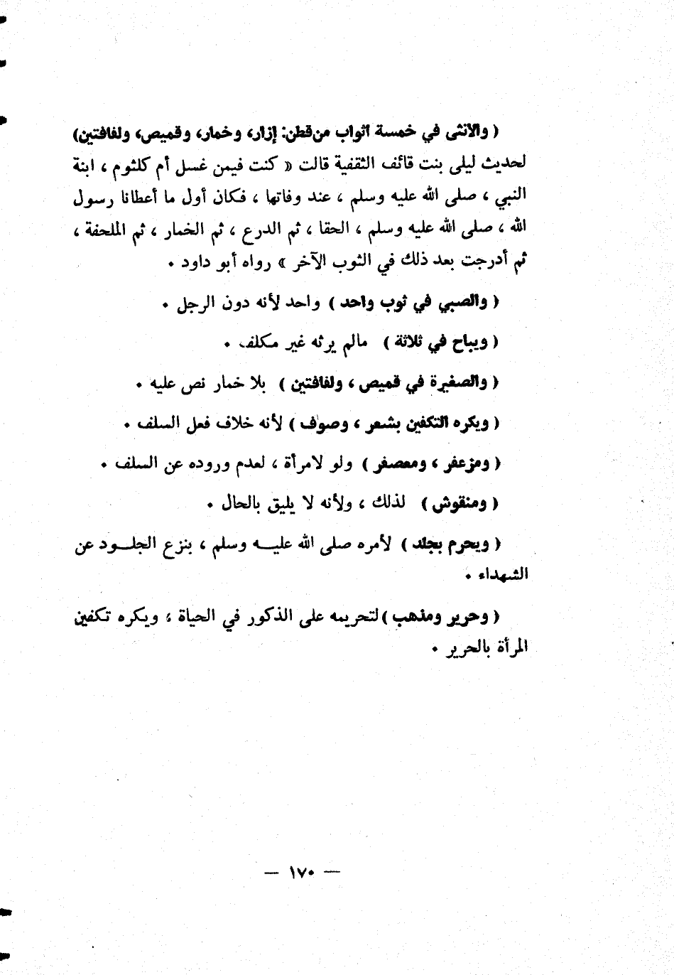 [والأنثى فى خمسة أثواب من قطن: إزار، وخمار، وقميص، ولفافتين] لحديث ليلى بنت قائف الثقفية قالت: كنت فيمن غسل أم كلثوم، ابنة النبى صلى الله عليه وسلم، عند وفاتها، فكان أول ما أعطانا رسول الله صلى الله عليه وسلم، الحقا، ثم الدرع، ثم الخمار، ثم الملحفة، ثم أدرجت بعد ذلك في الثوب الآخر رواه أبو داود.