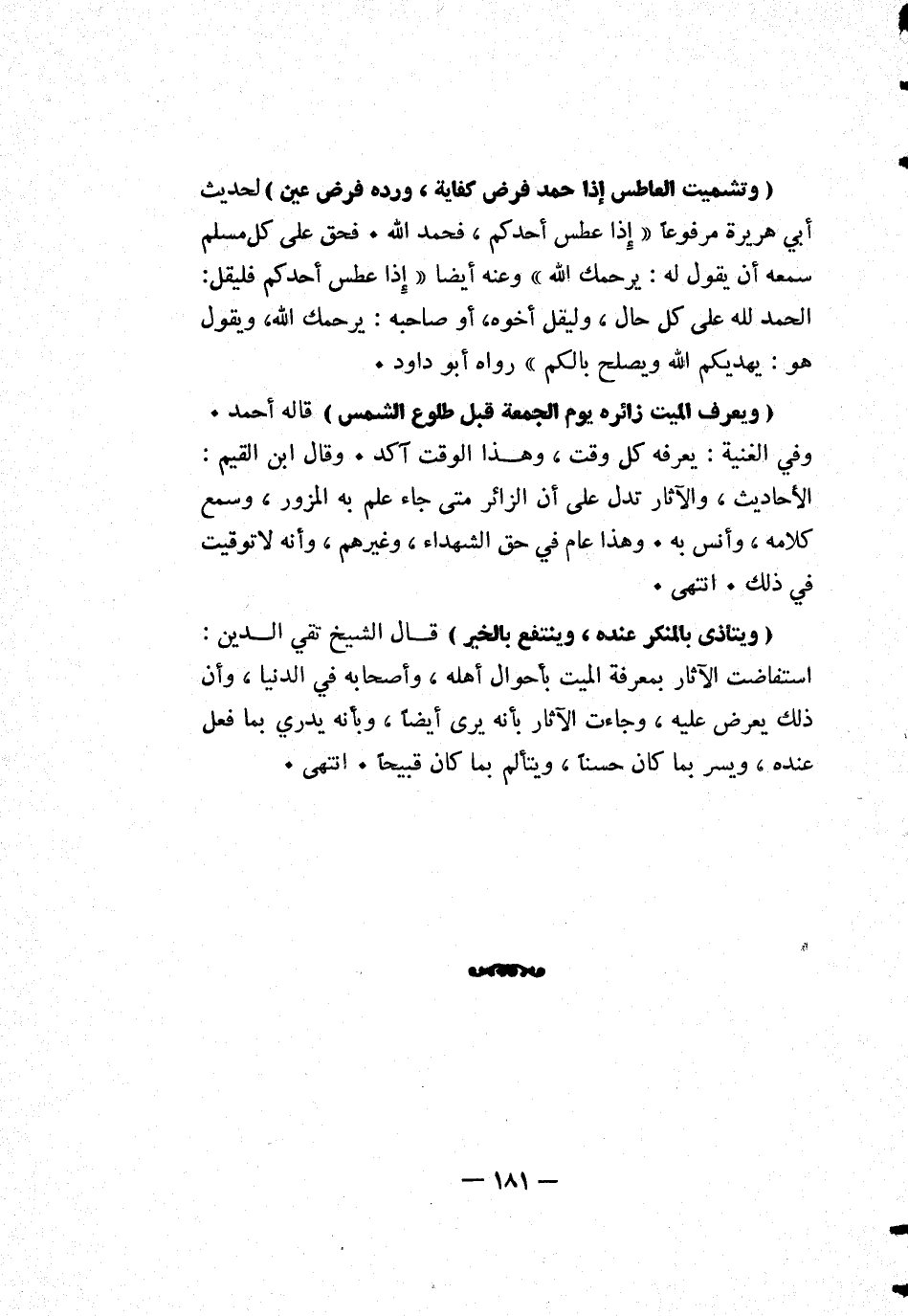 [وتشميت العاطس إذا حمد فرض كفاية، ورده فرض عين] لحديث أبي هريرة مرفوعاً: "إذا عطس أحدكم، فحمد الله، فحق على كل مسلم سمعه أن يقول له: يرحمك الله" وعنه أيضاً: "إذا عطس أحدكم فليقل: الحمد لله على كل حال، وليقل أخوه، أو صاحبه: يرحمك الله، ويقول هو: يهديكم الله ويصلح بالكم" رواه أبو داود.