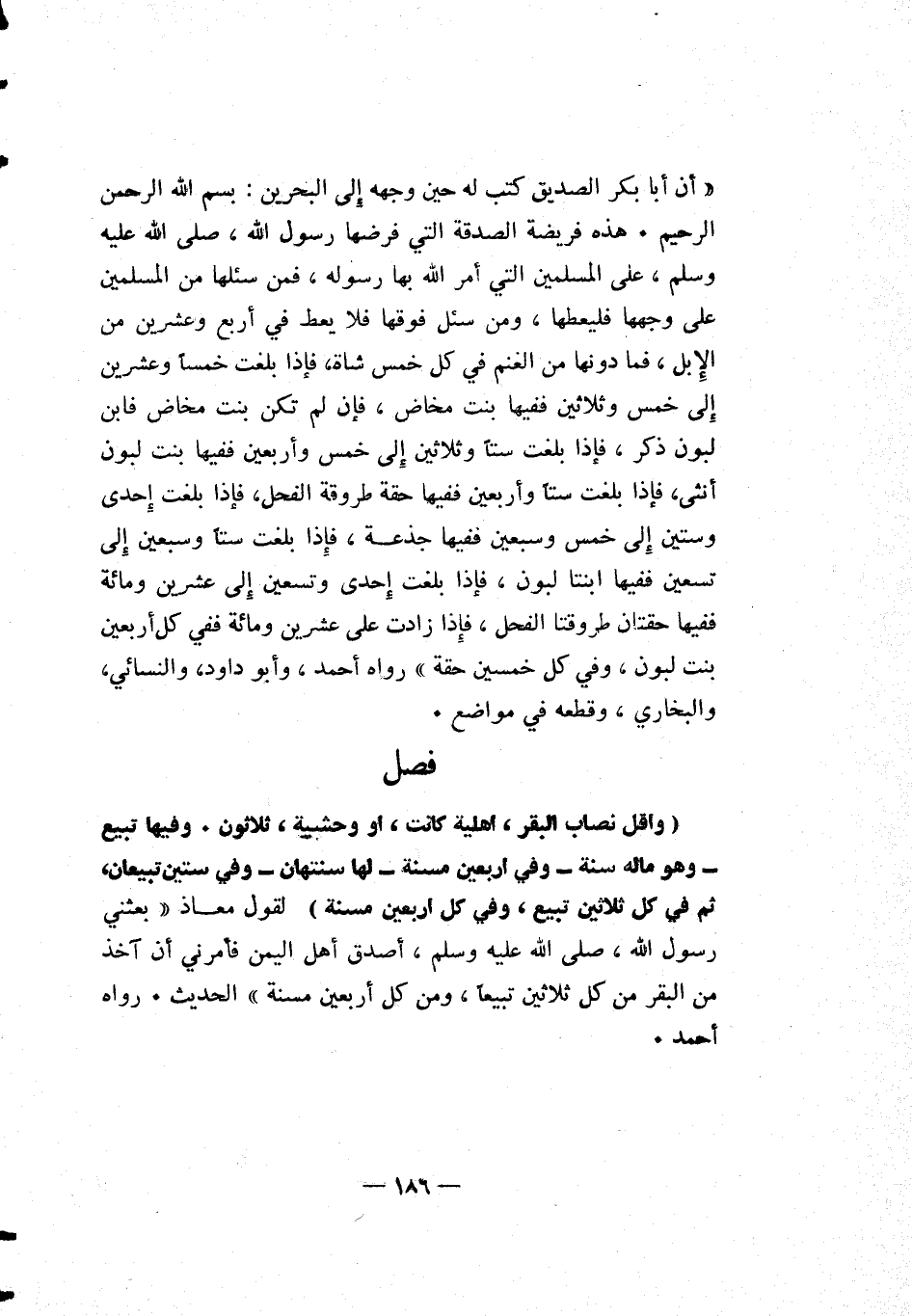 أن أبا بكر الصديق كتب له حين وجهه إلى البحرين: بسم الله الرحمن الرحيم. هذه فريضة الصدقة التي فرضها رسول الله صلى الله عليه وسلم على المسلمين التي أمر الله بها رسوله، فمن سئلها من المسلمين على وجهها فليعطها، ومن سئل فوقها فلا يعط في أربع وعشرين من الإبل، فما دونها من الغنم في كل خمس شاة، فإذا بلغت خمساً وعشرين إلى خمس وثلاثين ففيها بنت مخاض، فإن لم تكن بنت مخاض فابن لبون ذكر، فإذا بلغت ستاً وثلاثين إلى خمس وأربعين ففيها بنت لبون أنثى، فإذا بلغت ستاً وأربعين ففيها حقة طروقة الفحل، فإذا بلغت إحدى وستين إلى خمس وسبعين ففيها جذعة، فإذا بلغت ستاً وسبعين إلى تسعين ففيها ابنتا لبون، فإذا بلغت إحدى وتسعين إلى عشرين ومائة ففيها حقتان طروقتا الفحل، فإذا زادت على عشرين ومائة ففي كل أربعين بنت لبون، وفي كل خمسين حقة. رواه أحمد، وأبو داود، والنسائي، والبخاري، وقطعه في مواضع.