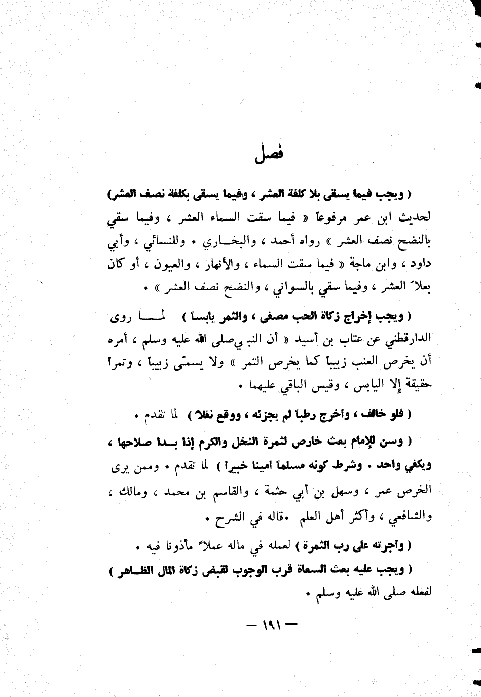 [ويجب فيما يسقى بلا كلفة العشر، وفيما يسقى بكلفة نصف العشر] لحديث ابن عمر مرفوعاً: "فيما سقت السماء العشر، وفيما سقي بالنًضح نصف العشر" رواه أحمد، والبخاري. وللنسائي، وأبي داود، وابن ماجه: "فيما سقت السماء، والأنهار، والعيون، أو كان بعلاً العشر، وفيما سقي بالسوًاني، والنضح نصف العشر".