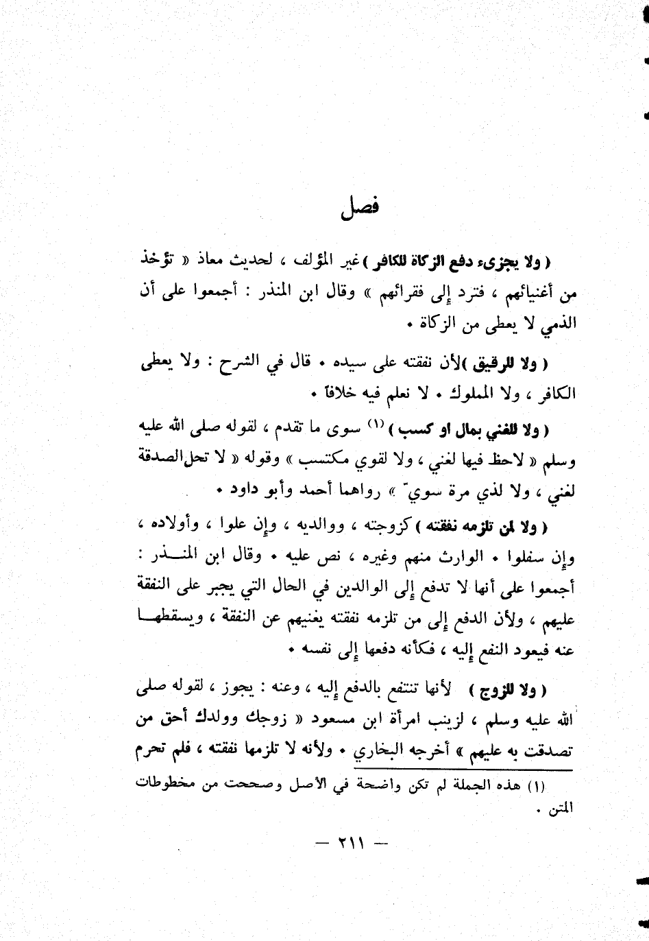 [ولا لمن تلزمه نفقته] كزوجته، ووالديه، وإن علوا، وأولاده، وإن سفلوا. الوارث منهم وغيره، نص عليه. وقال ابن المنذر: أجمعوا على أنها لا تدفع إلى الوالدين في الحال التي يجبر على النفقة عليهم، ولأن الدفع إلى من تلزمه نفقته يغنيهم عن النفقة، ويسقطها عنه فيعود النفع إليه، فكأنه دفعها إلى نفسه.