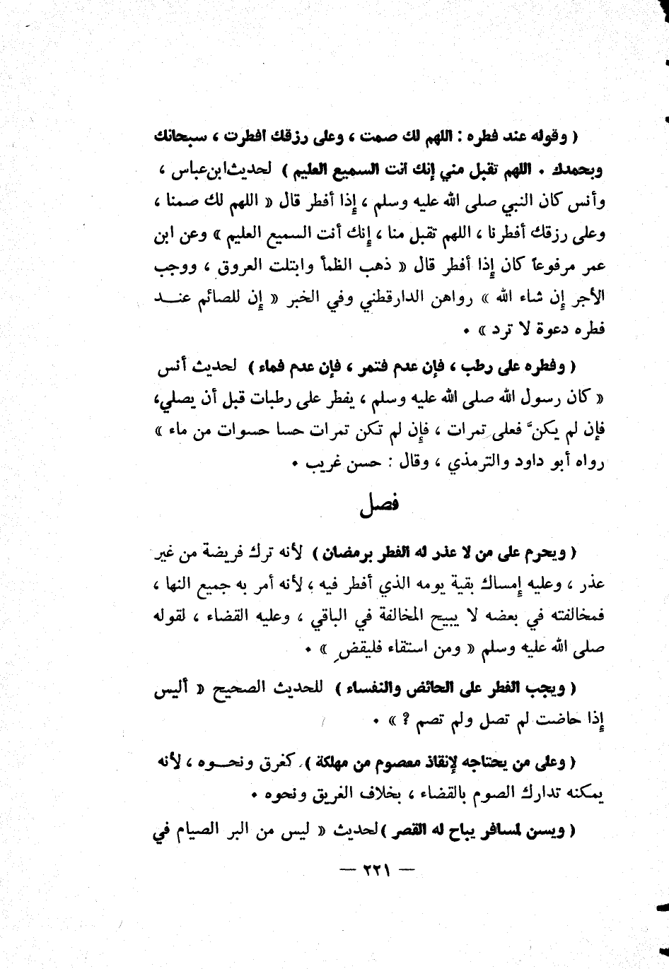 [وقوله عند فطره: اللهم لك صمت، وعلى رزقك أفطرت، سبحانك وبحمدك. اللهم تقبل مني إنك أنت السميع العليم] لحديث ابن العباس، وأنس كان النبي صلى الله عليه وسلم، إذا أفطر قال: "اللهم لك صمنا، وعلى رزقك أفطرنا، اللهم تقبل منا، إنك أنت السميع العليم" وعن ابن عمر مرفوعاً: كان إذا أفطر قال: "ذهب الظمأ وابتلت العروق، ووجب الأجر إن شاء الله" رواهن الدارقطني وفي الخبر: "إن للصائم عند فطره دعوةً لا ترد".