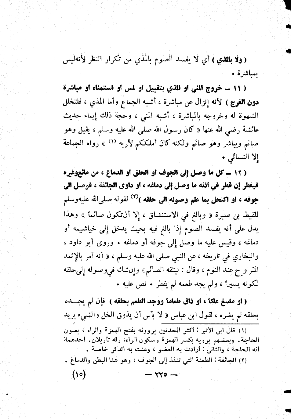 [11- خروج المني أوالمذي بتقبيل أو لمس أواستمناء أو مباشرة دون الفرج] لأنه إنزال عن مباشرة، أشبه الجماع وأما المذي، فلتخلل الشهوة له وخروجه بالمباشرة، أشبه المني، وحجة ذلك إيماء حديث عائشة رضي الله عنها كان رسول الله صلى الله عليه وسلم، يقبل وهو صائم ويباشر وهو صائم ولكنه كان أملككم لإربه.1 رواه الجماعة إلا النسائي.