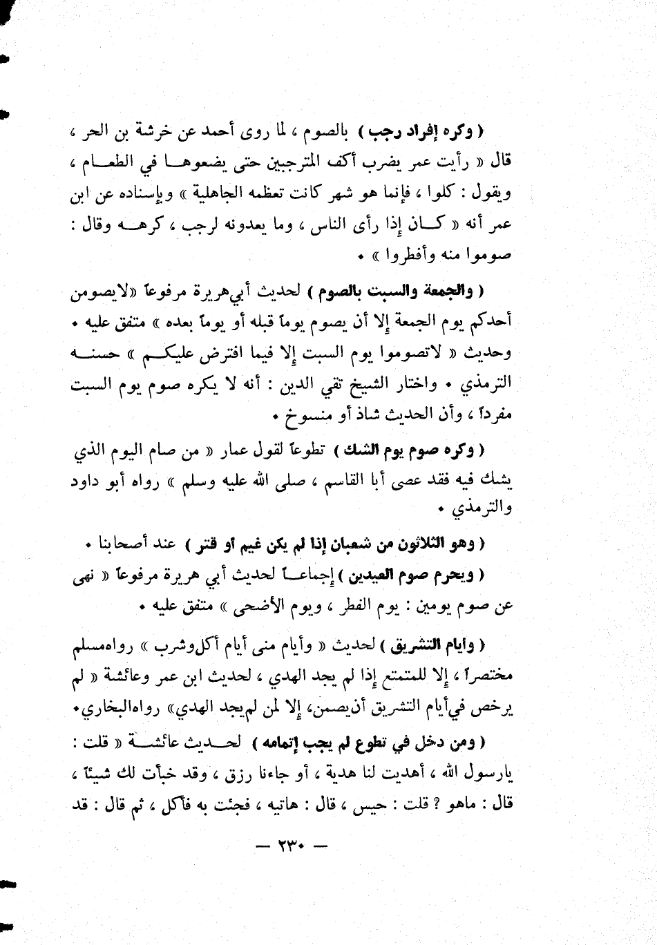 [والجمعة والسبت بالصوم] لحديث أبي هريرة مرفوعاً: "لا يصومن أحدكم يوم الجمعة إلا أن يصوم يوماً قبله أو يوماً بعده" متفق عليه. وحديث: "لا تصوموا يوم السبت إلا فيما افترض عليكم" حسنه الترمذي. واختار الشيخ تقي الدين: أنه لايكره صوم يوم السبت مفرداً، وأن الحديث شاذ أو منسوخ.