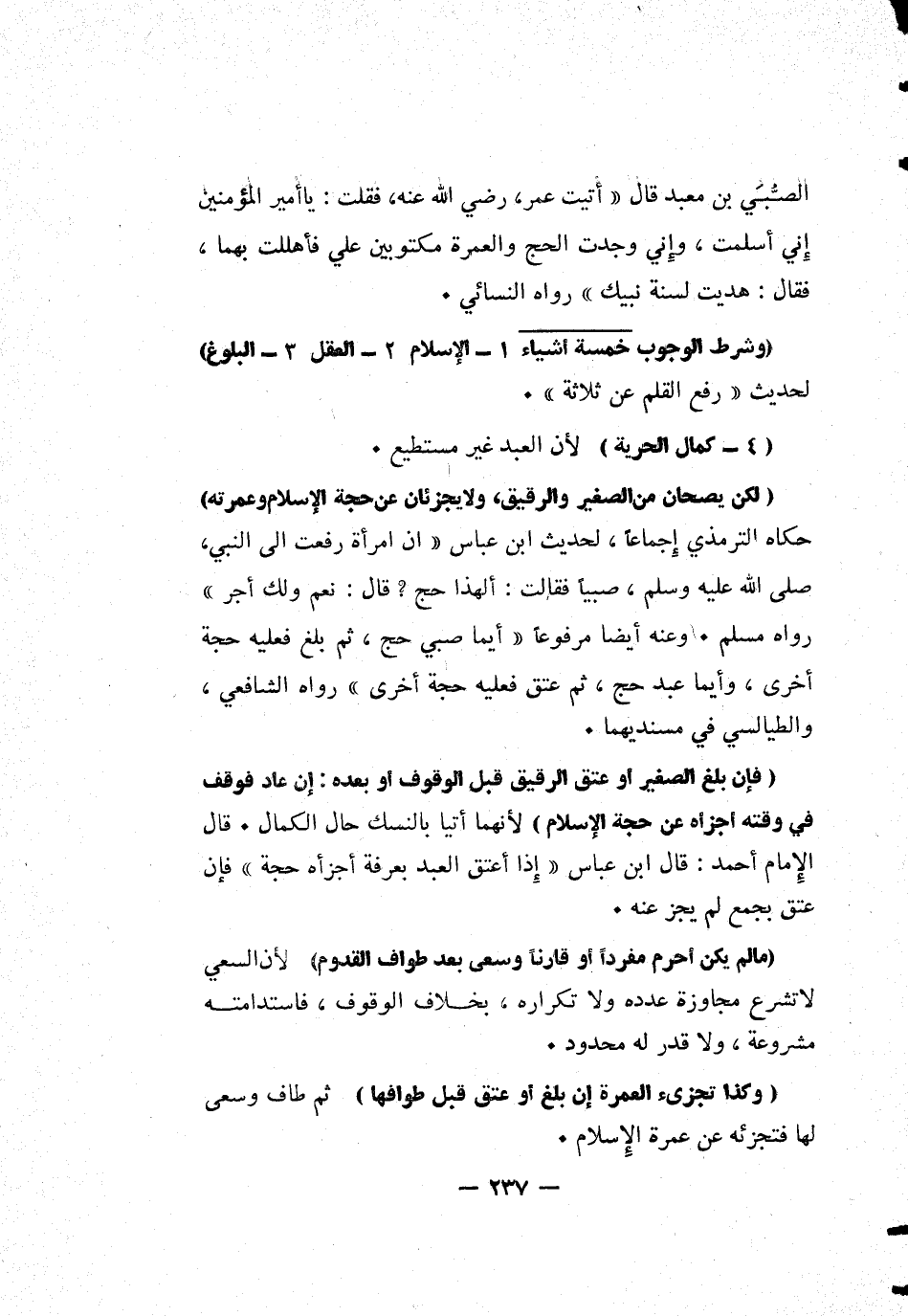 [فإن بلغ الصغير أو عتق الرقيق قبل الوقوف أو بعده: إن عاد فوقف في وقته أجزأه عن حجة الإسلام] لأنهما أتيا بالنسك حال الكمال. قال الإمام أحمد: قال ابن عباس: إذا أعتق العبد بعرفة أجزأه حجه فإن عتق بجمع لم يجز عنه.