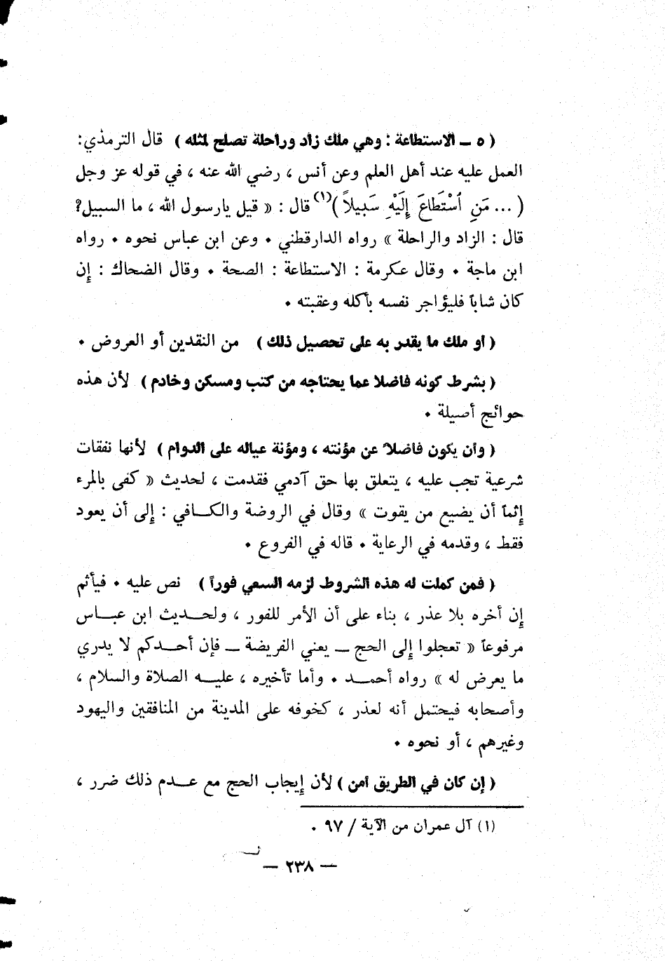 [5- الإستطاعة: وهي ملك زاد وراحلة تصلح لمثله] قال الترمذي: العمل عليه عند أهل العلم وعن أنس، رضي الله عنه، في قوله عز وجل: {مَنِ اسْتَطَاعَ إِلَيْهِ سَبِيلاً} 1 قال: قيل يا رسول الله، ما السبيل قال: "الزاد والراحلة" رواه الدارقطني. وعن ابن عباس نحوه. رواه ابن ماجه. وقال عكرمة: الإستطاعة: الصحة. وقال الضحاك: إن كان شاباً فليؤاجر نفسه بأكله وعقبته.