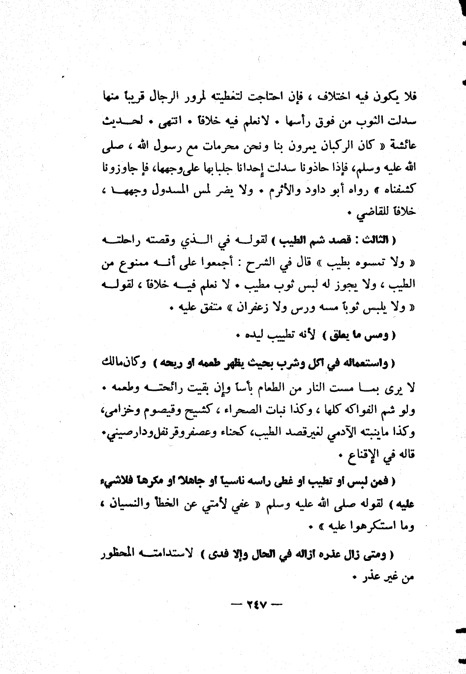 [الثالث: قصد شم الطيب] لقوله في الذي وقصته راحلته "ولا تمسوه بطيب" قال في الشرح: أجمعوا على أنه ممنوع من الطيب، ولا يجوز له لبس ثوب مطيب. لا نعلم فيه خلافاً، لقوله: "ولايلبس ثوباً مسه ورس ولا زعفران" متفق عليه.