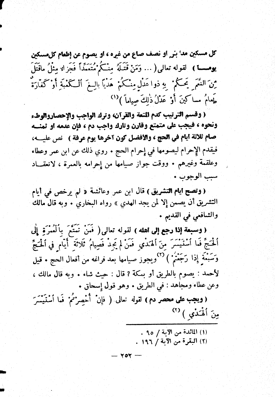 كل مسكين مد بر أو نصف صاع من غيره، أو يصوم عن إطعام كل مسكين يوماً] لقوله تعالى: {وَمَنْ قَتَلَهُ مِنْكُمْ مُتَعَمِّداً فَجَزَاءٌ مِثْلُ مَا قَتَلَ مِنَ النَّعَمِ يَحْكُمُ بِهِ ذَوَا عَدْلٍ مِنْكُمْ هَدْياً بَالِغَ الْكَعْبَةِ أَوْ كَفَّارَةٌ طَعَامُ مَسَاكِينَ أَوْ عَدْلُ ذَلِكَ صِيَاماً} 1