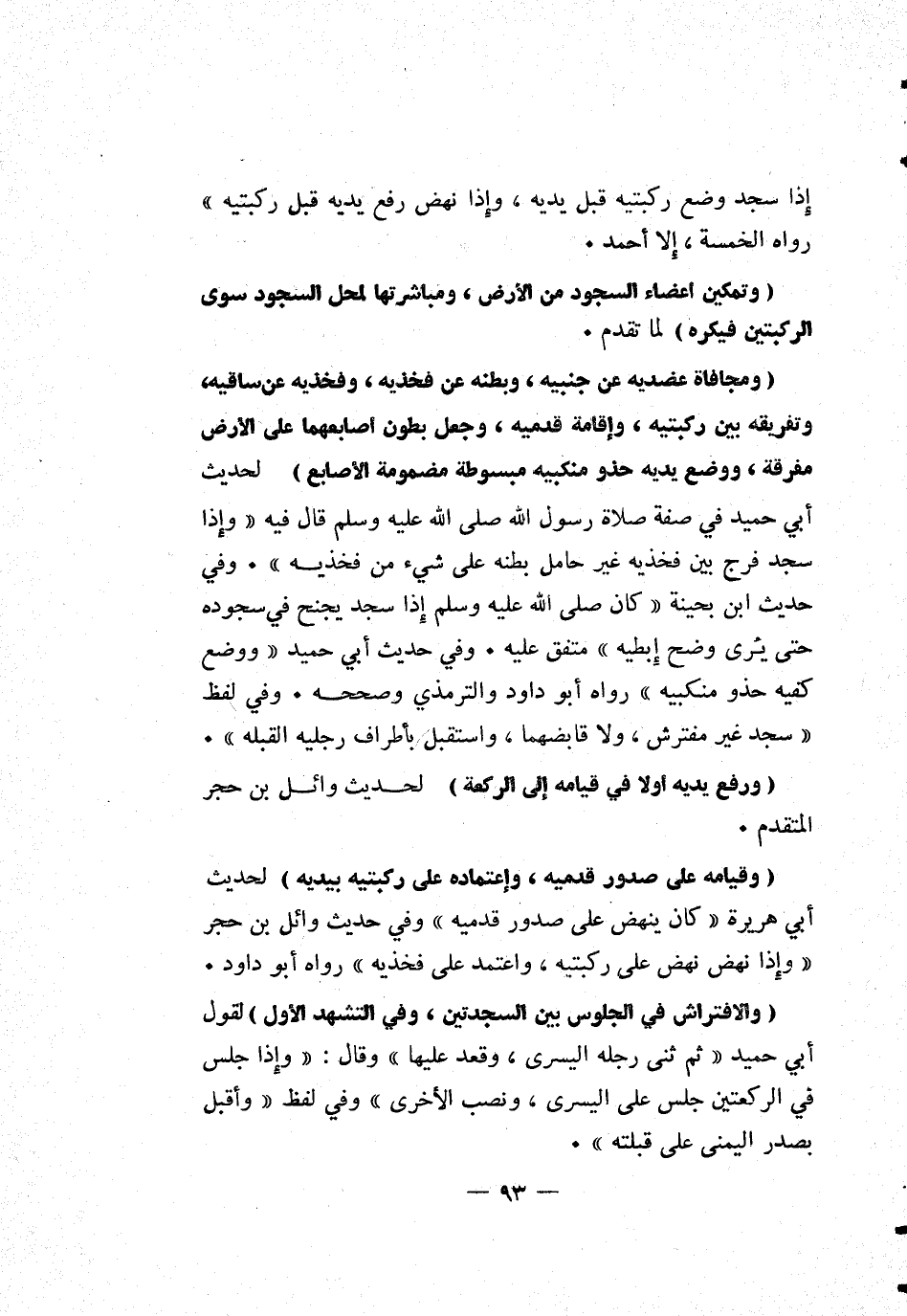 [وقيامه على صدور قدميه، وإعتماده على ركبتيه بيديه] لحديث أبي هريرة كان ينهض على صدور قدميه وفي حديث وائل بن حجر وإذا نهض نهض على ركبتيه، واعتمد على فخذيه رواه أبو داود.