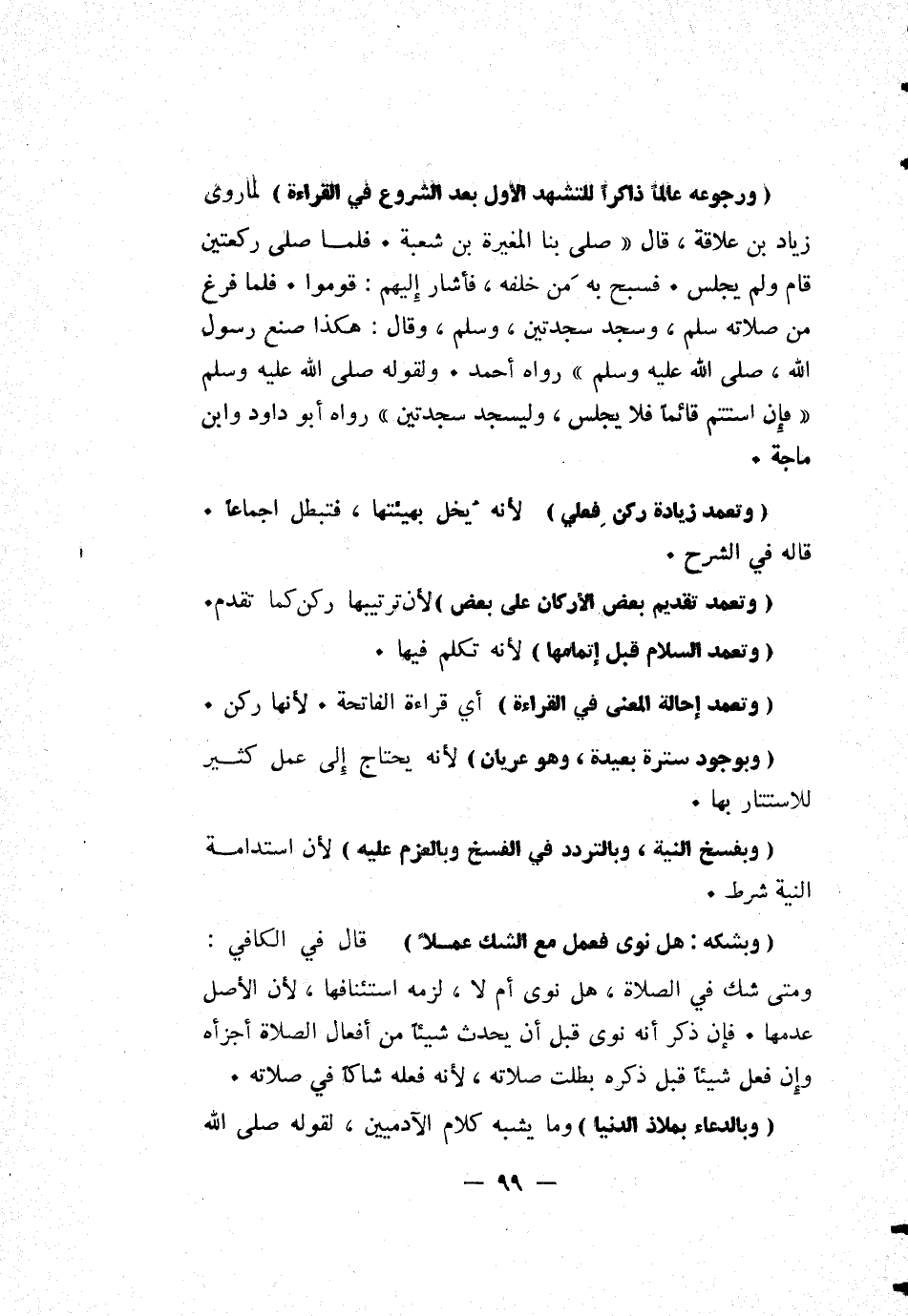 [وبشكه: هل نوى فعمل مع الشك عملاً] قال في الكافي: ومتى شك في الصلاة، هل نوى أم لا، لزمه استئنافها، لأن الأصل عدمها. فإن ذكر أنه نوى قبل أن يحدث شيئاً من أفعال الصلاة أجزأه، وإن فعل شيئاً قبل ذكره بطلت صلاته، لأنه فعله شاكاً في صلاته.