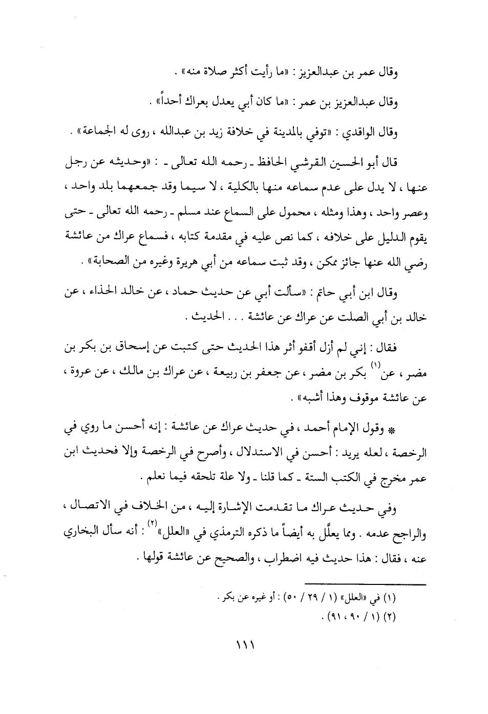 قال أبو الحسين القرشي الحافظ -رحمه الله تعالى-: "وحديثه عن رجل عنها، لا يدل على عدم سماعه منها بالكلية، لا سيما وقد جمعهما بلد واحد، وعصر واحد، وهذا ومثله، محمول على السماع عند مسلم -رحمه الله تعالى- حتى يقوم الدليل على خلافه، كما نص عليه في مقدمة كتابه، فسماع عراك من عائشة رضي الله عنها جائز ممكن، وقد ثبت سماعه من أبي هريرة وغيره من الصحابة".