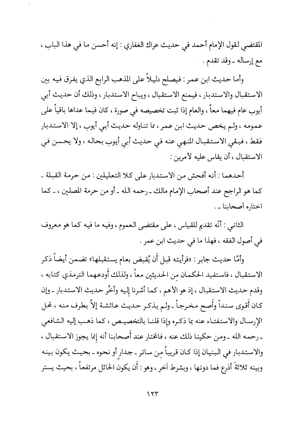 وأما حديث ابن عمر: فيصلح دليلًا على المذهب الرابع الذي يفرق فيه بين الاستقبال والاستدبار، فيمنع الاستقبال، ويباح الاستدبار، وذلك أن حديث أبي أيوب عام فيهما معًا، والعام إذا ثبت تخصيصه في صورة، كان فيما عداها باقيًا على عمومه، ولم يخص حديث ابن عمر، مما تناوله حديث أبي أيوب، إلا الاستدبار فقط، فبقي الاستقبال المنهي عنه في حديث أبي أيوب بحاله، ولا يحسن في الاستقبال، أن يقاس عليه لأمرين: